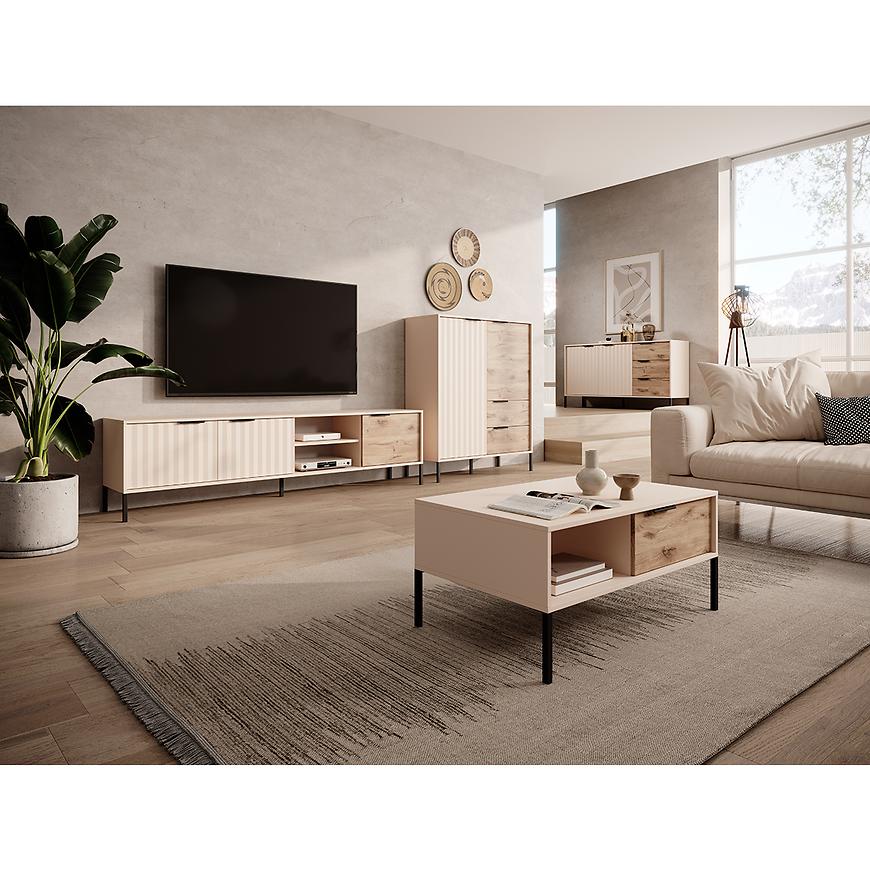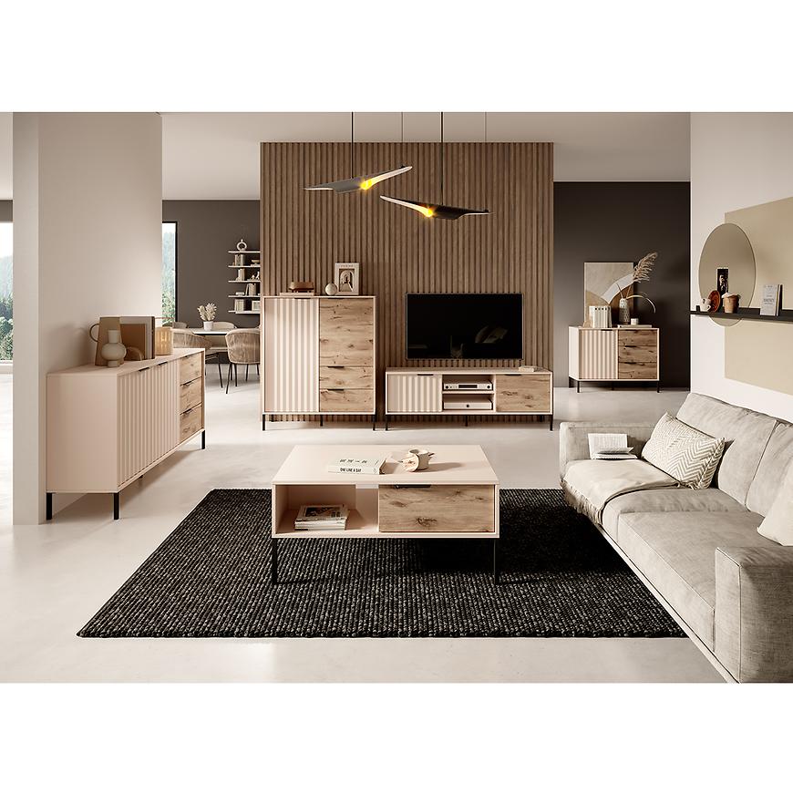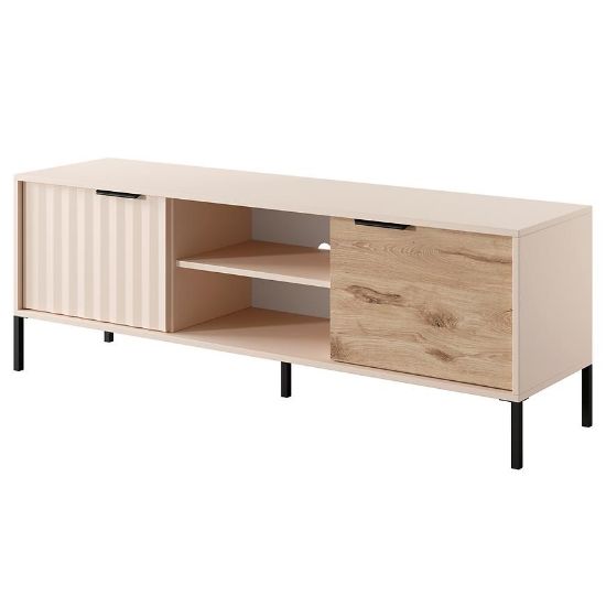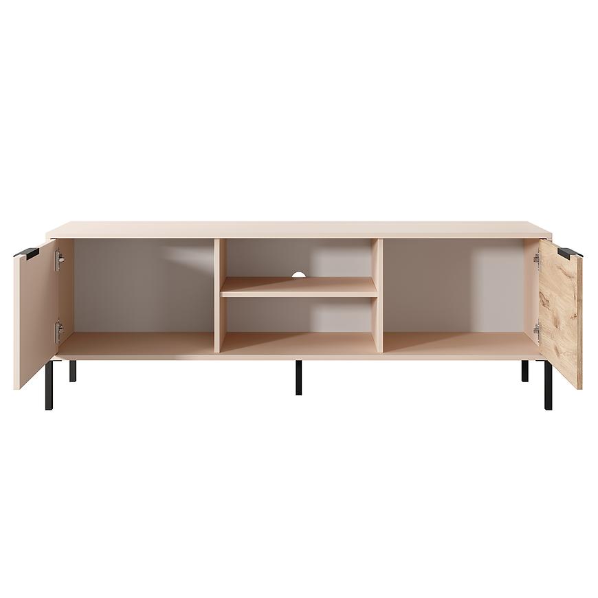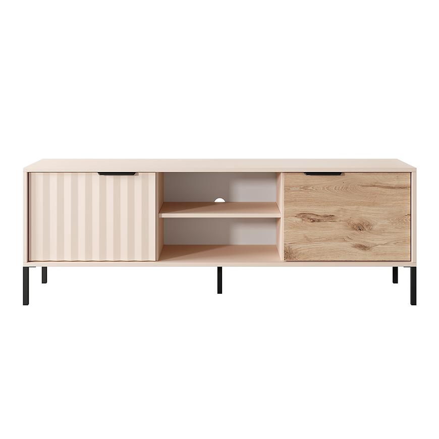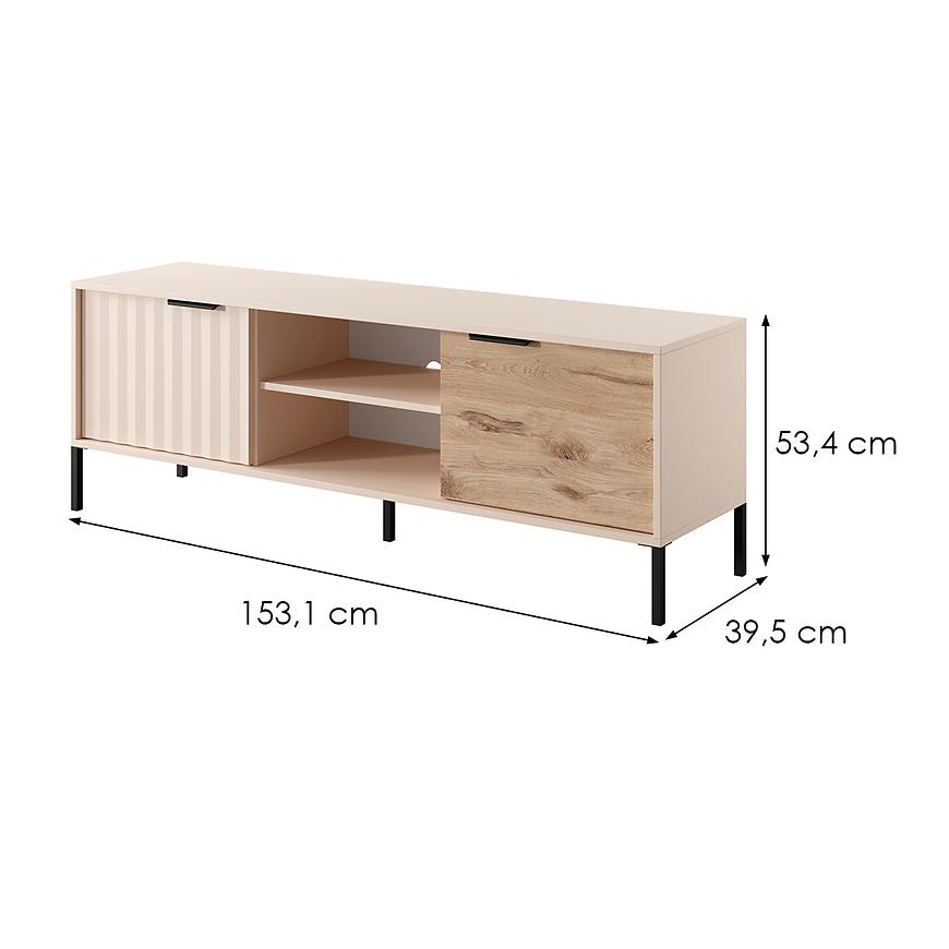 Szafka RTV RAVE w kolorze beżu z dębowym wykończeniem to mistrzowskie połączenie funkcjonalności, stylu i nowoczesnego designu. Wykonana z trwałej płyty wiórowej laminowanej o matowym wykończeniu, ta szafka nie tylko prezentuje się elegancko, ale również gwarantuje długotrwałą trwałość.