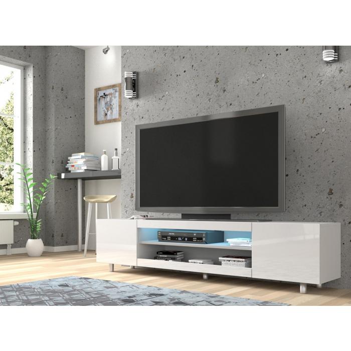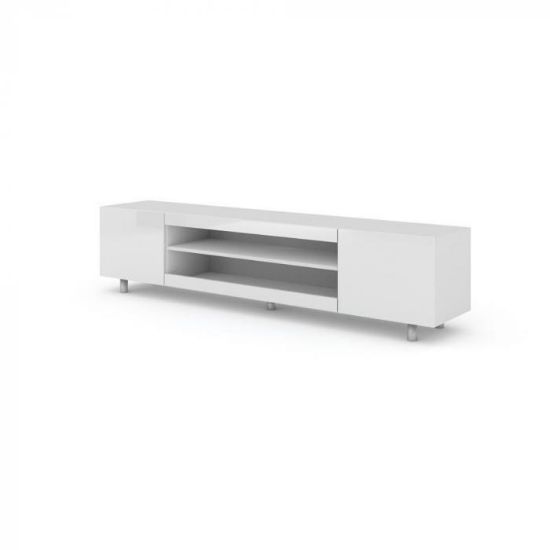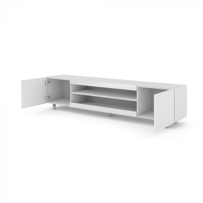 Szafka RTV posiada dwie szafki otwierane na boki, dwie otwarte podłużne półki, szafka bezuchwytowa - fronty lekko wystają ponad blat szafki, a także stabilne i eleganckie nóżki, dwie listwy ozdobne . To mebel, który z pewności pomieści sprzęt RTV, ale także inne nasze drobiazgi, akcesoria, czy książki.