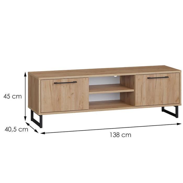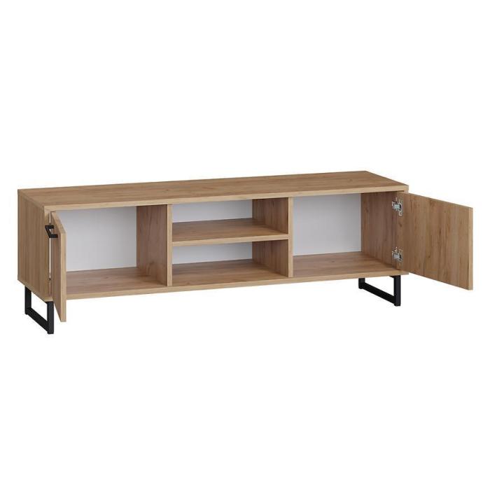 Szafka RTV posiada dwie szafki oraz otwarte półki. Mebel może być świetnym uzupełnieniem aranżacji w salonie i w pokoju młodzieżowym.
