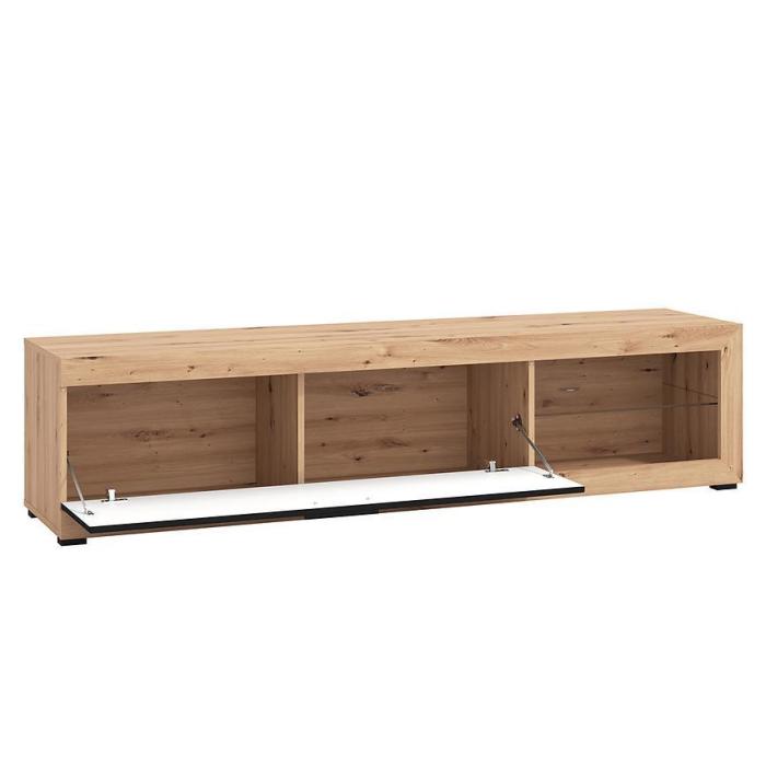 Szafka RTV posiada jedną szafkę z uchylnymi drzwiami i otwartą półkę. Komoda może być świetnym uzupełnieniem aranżacji w salonie i w pokoju młodzieżowym.