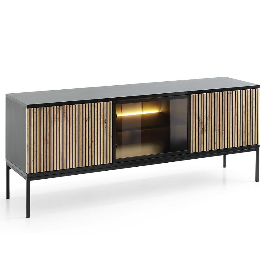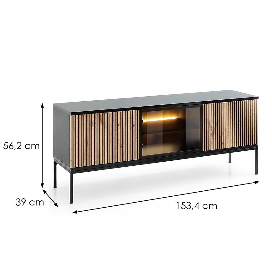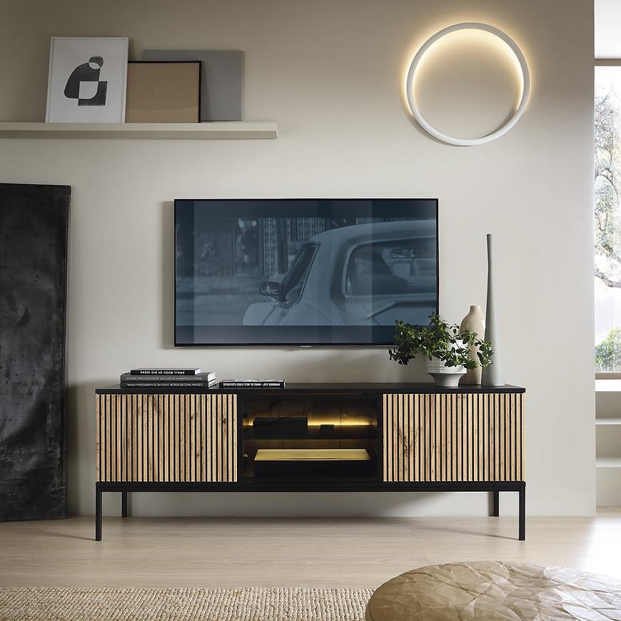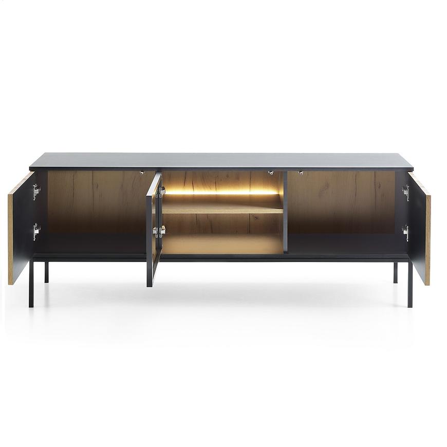 Trzydrzwiowy układ szafki RTV Sento zapewnia obfite miejsce do przechowywania różnych urządzeń multimedialnych, a dostępność oświetlenia LED w standardzie dodaje jej dodatkowego uroku, podkreślając jednocześnie piękno kolekcji Sento. Ten nowoczesny detal sprawia, że szafka staje się nie tylko praktycznym meblem, ale również atrakcyjnym elementem dekoracyjnym w każdym salonie.