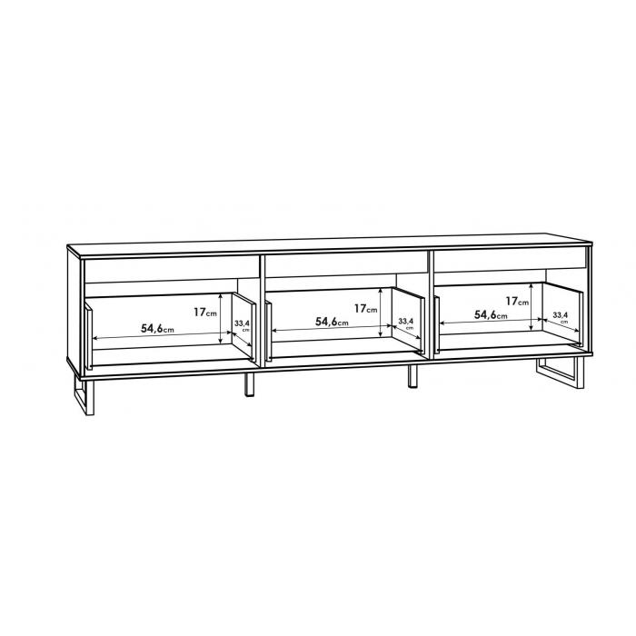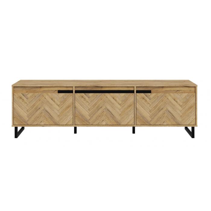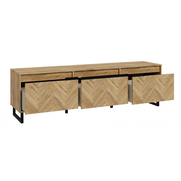 System Soletico dostępny jest w ciekawym wybarwieniu frontów dąb spica, wzór na frontach układa się w efektowną jodełkę. Wybarwienie korpusów to dąb bartex. Meble kolekcji Soletico wyposażone są w czarne metalowe nóżki które są ciekawym dodatkiem podkreślają loftowy charakter kolekcji. Uchwyty wykonane z materiału drewnopochodnego w kolorze czarnym. Meble z kolekcji Soletico to propozycja dla wielbicieli stylu minimalistycznego oraz surowego który charakteryzuje kolekcję Soletico. W skład kolekcji wchodzą komody, witryny, szafka RTV, stolik, stół rozkładany oraz wiszące półki.