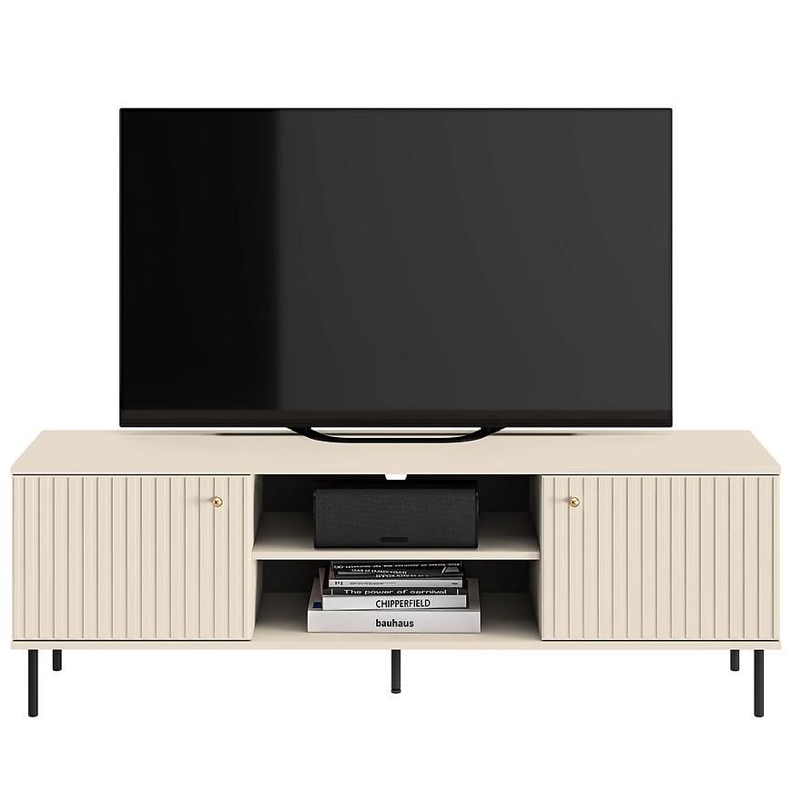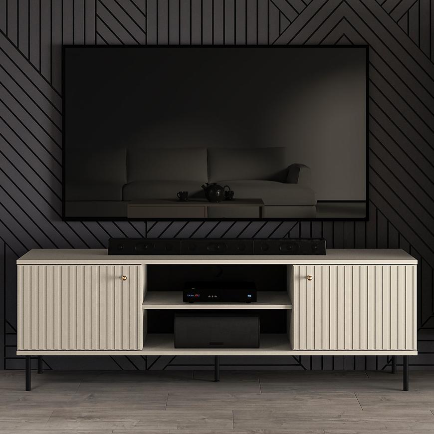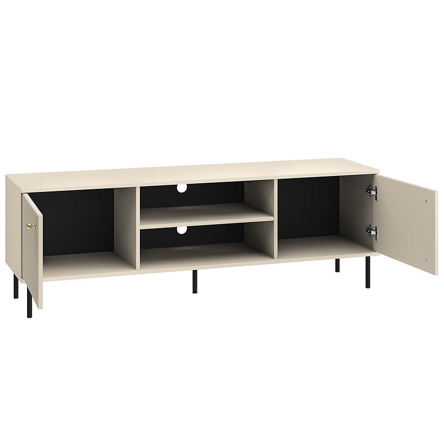 Kolorystyka i wykończenie: Szafka RTV Sophie 06 utrzymana jest w jednolitym odcieniu cashmere, co nadaje jej elegancki i nowoczesny charakter. Matowe wykończenie zarówno frontów, jak i korpusu podkreśla jej subtelną estetykę, wprowadzając do wnętrza spokój i harmonię.