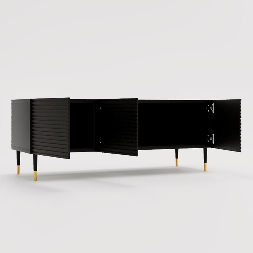Trzydrzwiowy układ ułatwia zachowanie pełnego porządku — wewnątrz bez trudu zmieszczą się konsole, sterowniki, piloty, okablowanie czy kolekcje płyt. Gładkie, czarne fronty tworzą spójną całość z korpusem, a matowe wykończenie podkreśla minimalistyczny styl.