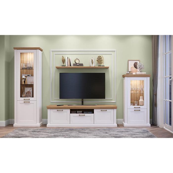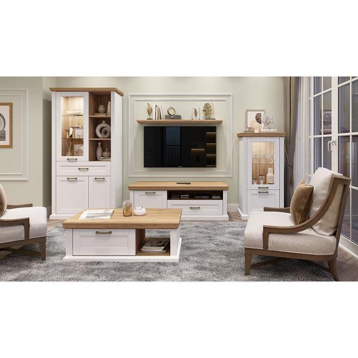 Kolekcja Tara w kolorze white/pacific walnut świetnie prezentuje się w nowoczesnych wnętrzach. Szafka rtv doskonale sprawdzi się w każdym salonie lub innym, dowolnym pomieszczeniu. Wykonana jest z płyty MDF lakierowanej/wiórowej laminowanej.