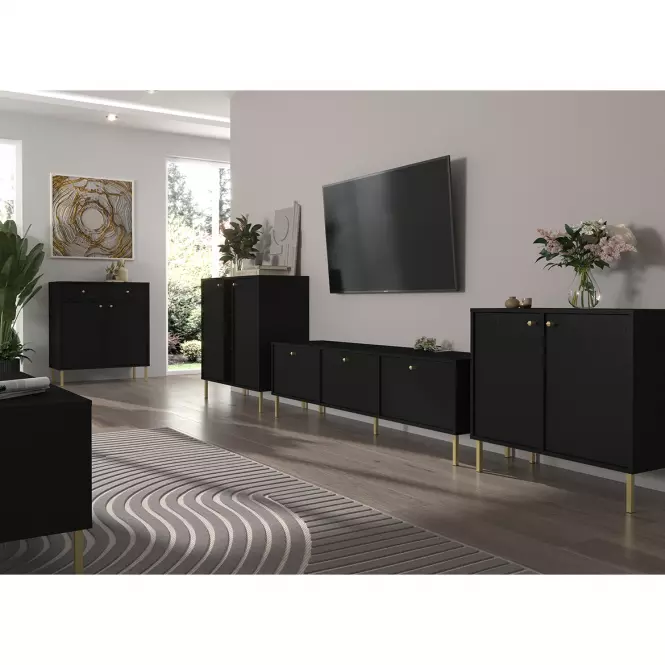 Praktyczność i funkcjonalność: Przestronna szafka RTV pomieści wszystkie urządzenia multimedialne, a jej przemyślany układ pozwala na wygodne organizowanie przestrzeni.