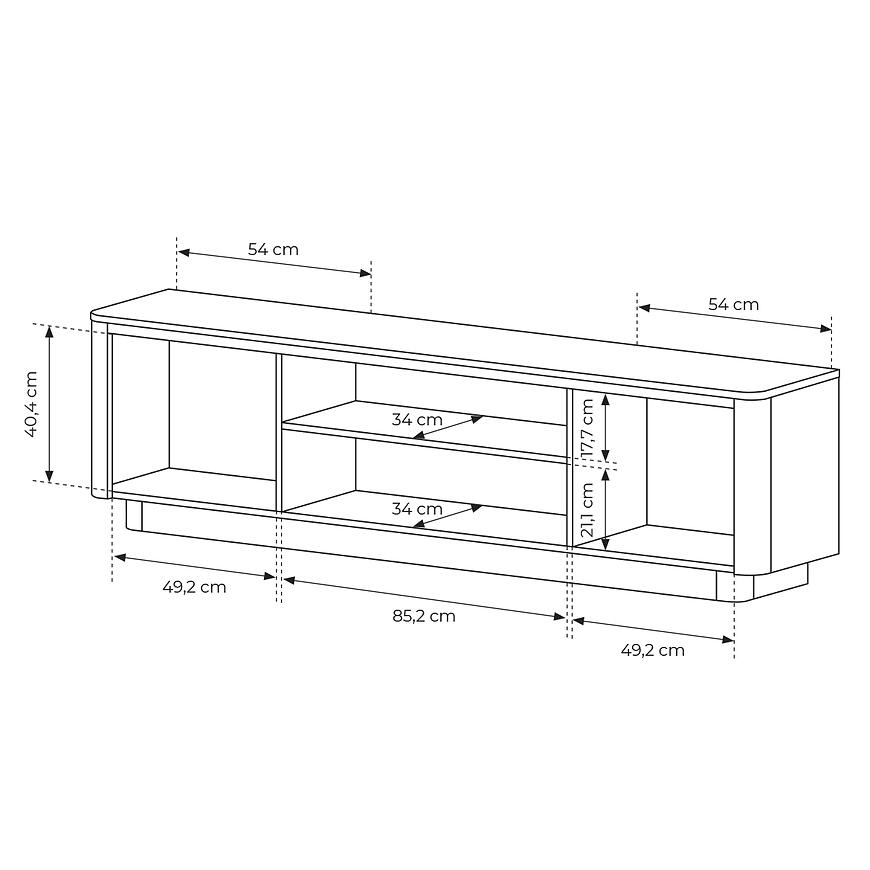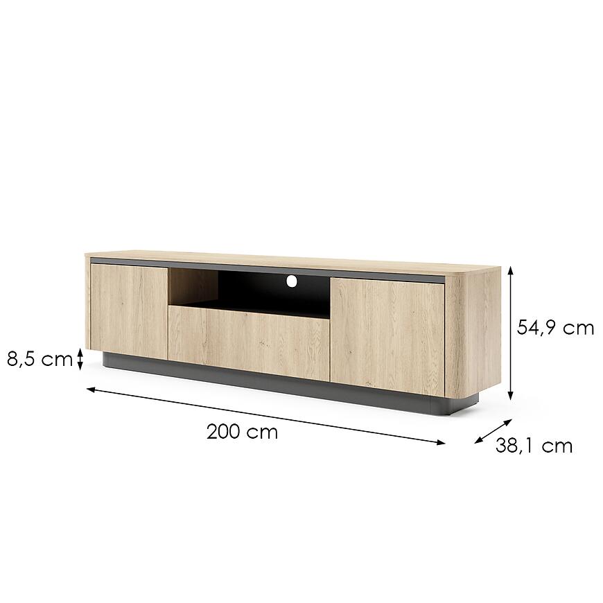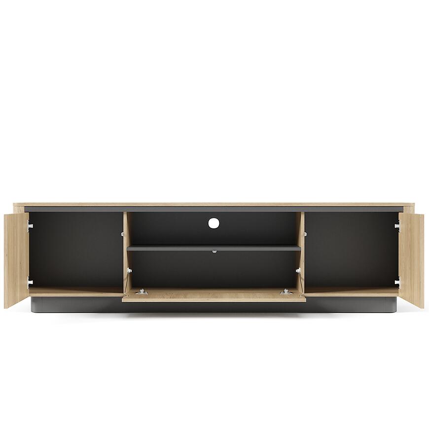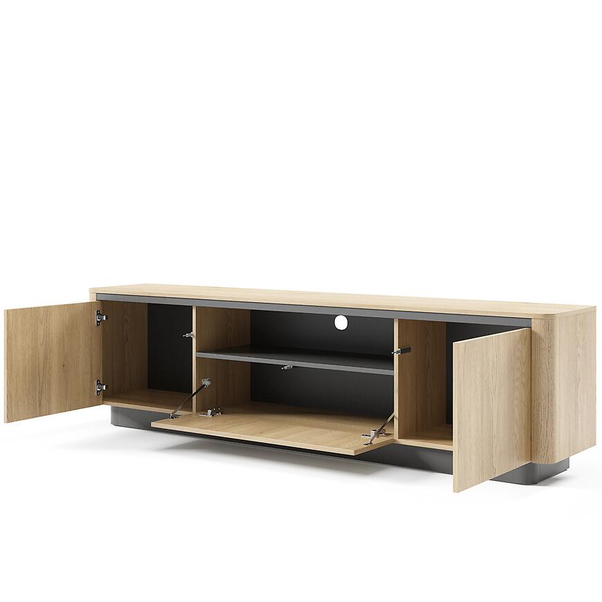 Mebel został wyposażony w trzy drzwi, za którymi znajdują się pojemne schowki umożliwiające przechowywanie sprzętu RTV, płyt, pilotów, konsol, a także innych akcesoriów codziennego użytku. Szafka pozwala zachować porządek w pomieszczeniu, ukrywając nieestetyczne przewody i urządzenia, a jej konstrukcja zapewnia łatwy dostęp do wszystkich przedmiotów. Brak szuflad sprawia, że przestrzeń wewnętrzna może być wykorzystana w sposób elastyczny i dopasowany do indywidualnych potrzeb użytkownika.