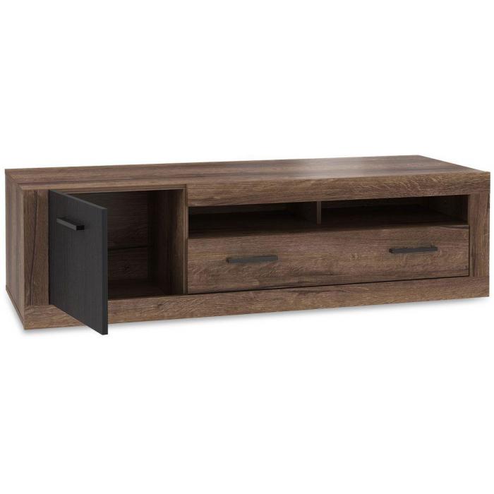 Szafka RTV Trass TRAT121 to nowoczesny mebel, który łączy w sobie funkcjonalność i wysoce estetyczne, proste wzornictwo. Model ten stanowi kwintesencję skandynawskiego designu. Dzięki temu będzie doskonałym uzupełnieniem aranżacji różnych pomieszczeń. Sprawdzi się w pokoju dziennym, jadalni czy sypialni. Ciemna kolorystyka dębu szlachetnego perfekcyjnie koresponduje z czernią prostokątnych uchwytów. Szafkę RTV Trass TRAT121 wykonano z płyty laminowanej o grubości 15 mm. W projekcie zadbano nie tylko o jej nienaganny wygląd, ale pomyślano również o odpowiedniej ilości miejsca do przechowywania. Ten funkcjonalny mebel można z łatwością komponować z innymi rozwiązaniami z kolekcji Trass.