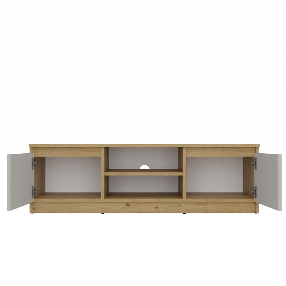 Wykonana z trwałej płyty wiórowej laminowanej o grubości 16 mm, szafka zapewnia solidność i odporność na codzienne użytkowanie. Dwie boczne szafki bez półek oferują mnóstwo miejsca do przechowywania sprzętów, kabli czy innych domowych drobiazgów. Otwarta półka środkowa idealnie nadaje się na dekoder, konsolę czy odtwarzacz, a praktyczny otwór z tyłu ułatwia estetyczne i dyskretne poprowadzenie kabli.
