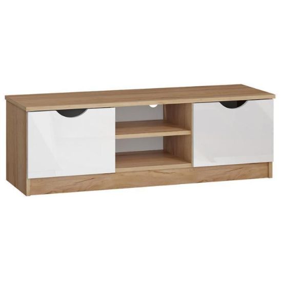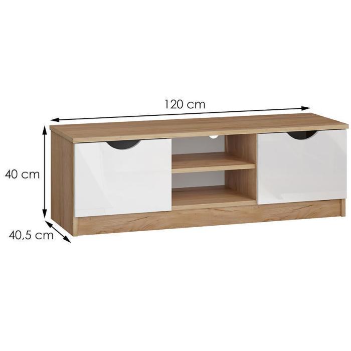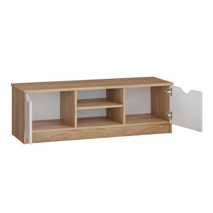 Szafka RTV posiada dwie szafki oraz otwarte półki. Mebel może być świetnym uzupełnieniem aranżacji w salonie i w pokoju młodzieżowym.