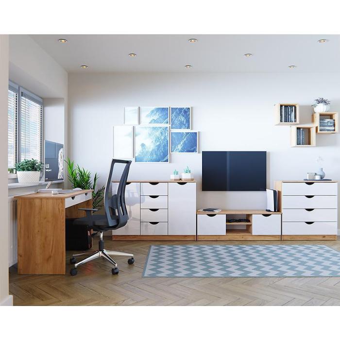Wykonana z płyty wiórowej laminowanej w kolorze dąb craft złoty/ biały połysk.