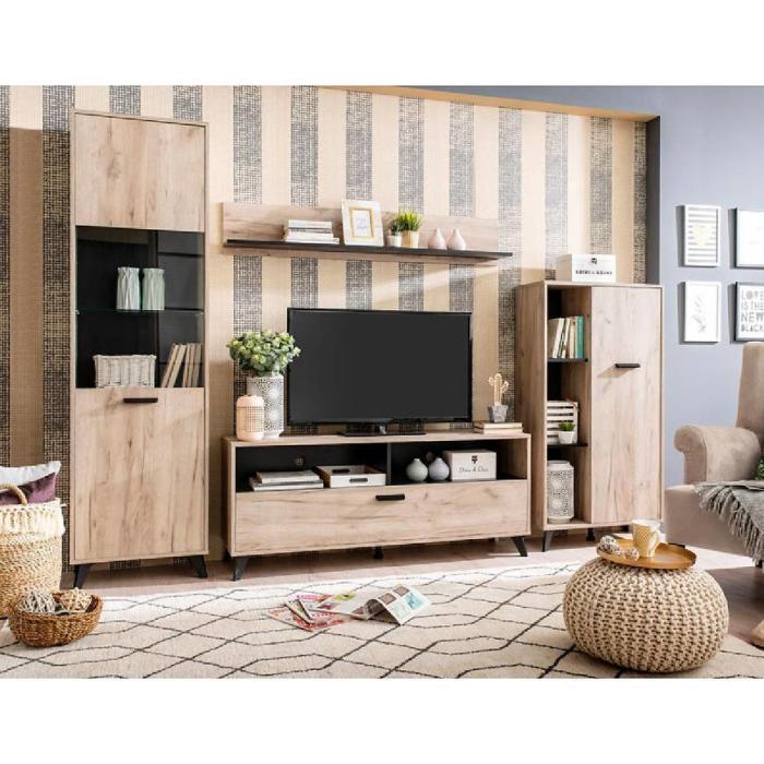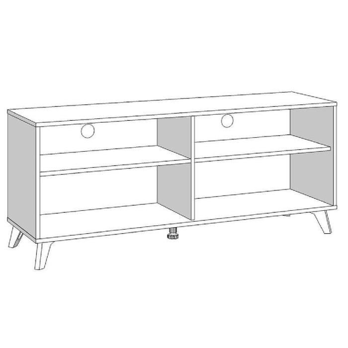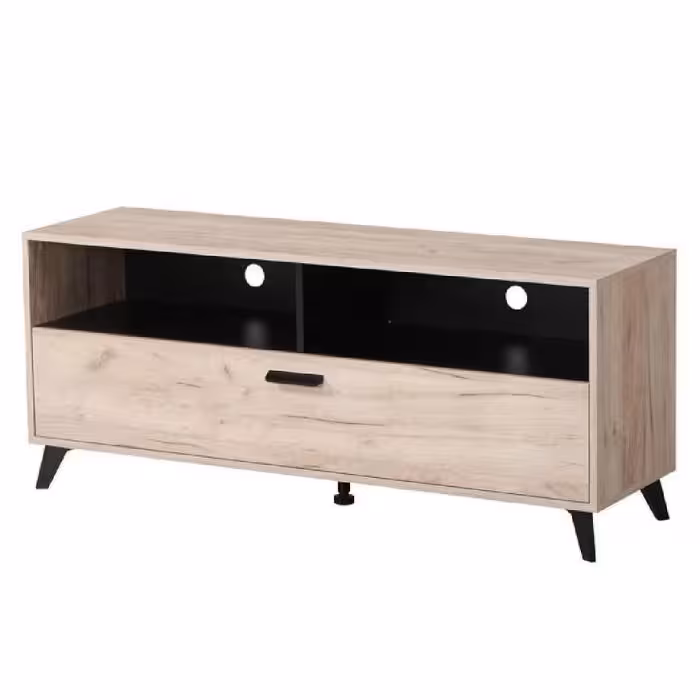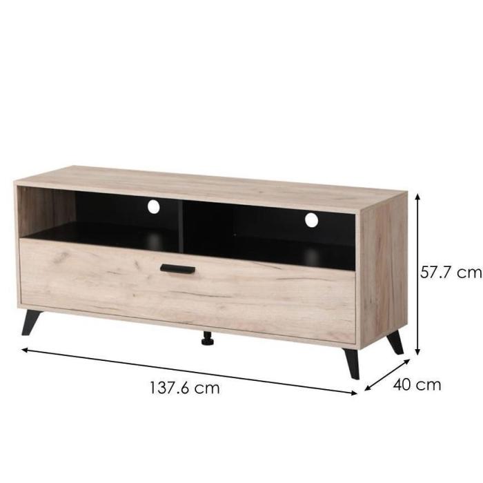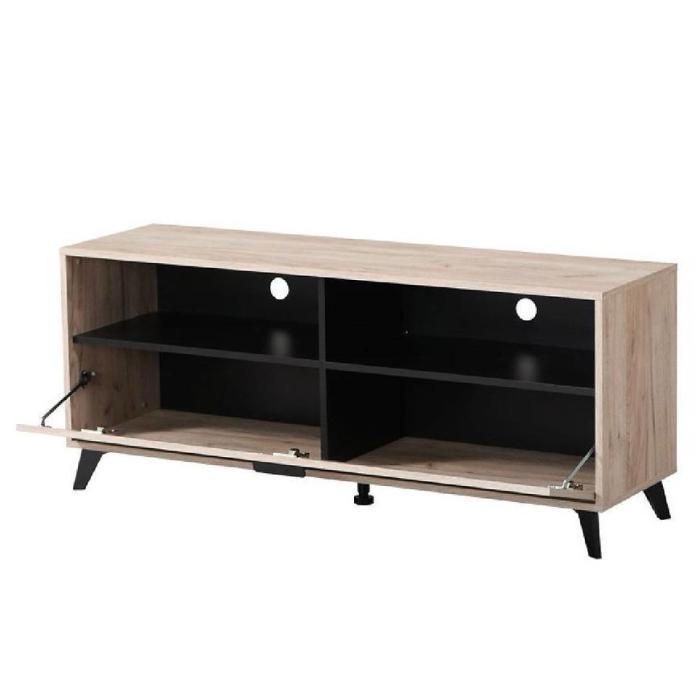 Szafka RTV posiada jedną szafkę z uchylnymi drzwiami i dwie otwarte półki. Mebel może być świetnym uzupełnieniem aranżacji w salonie i w pokoju młodzieżowym.