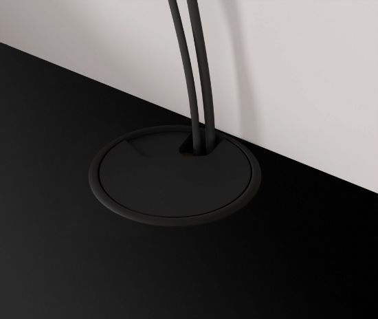 Plastikowy uchwyt w kolorze czarnym oraz maskownica otworu na kable nadają szafce elegancki wygląd, jednocześnie utrzymując porządek w przestrzeni. Otwór na kable w górnej płycie umożliwia schludne prowadzenie kabli, eliminując nieestetyczne zamieszanie.