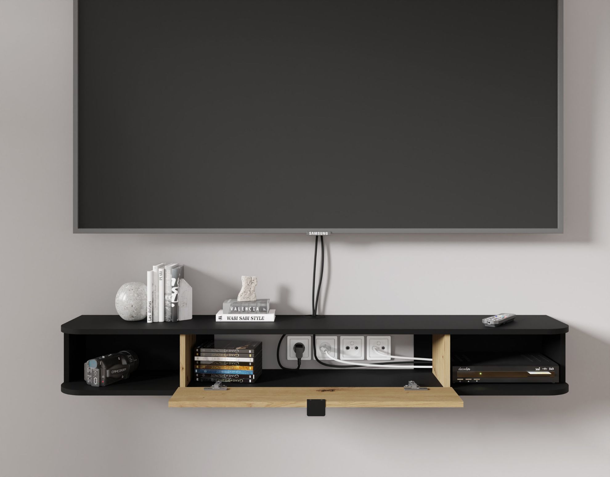 Schowek otwierany ku dołowi to praktyczne rozwiązanie, które ułatwia dostęp do przechowywanych urządzeń czy akcesoriów. Wolna przestrzeń za schowkiem pozwala na sprytne ukrycie przewodów czy zasilaczy, zachowując jednocześnie estetyczny wygląd.