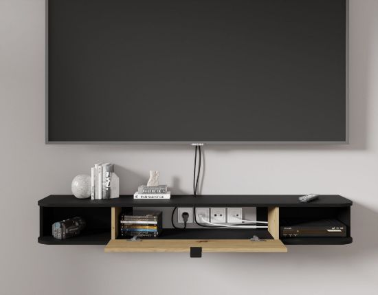Szafka RTV Wing w wyrazistym połączeniu czarny matowym z dąb artisan to nie tylko funkcjonalne, ale również designerskie rozwiązanie do aranżacji nowoczesnego salonu. Wykonana z najwyższej jakości materiałów, ta szafka nie tylko spełnia praktyczne potrzeby, ale również wkomponowuje się w elegancki i nowoczesny wystrój wnętrza.
