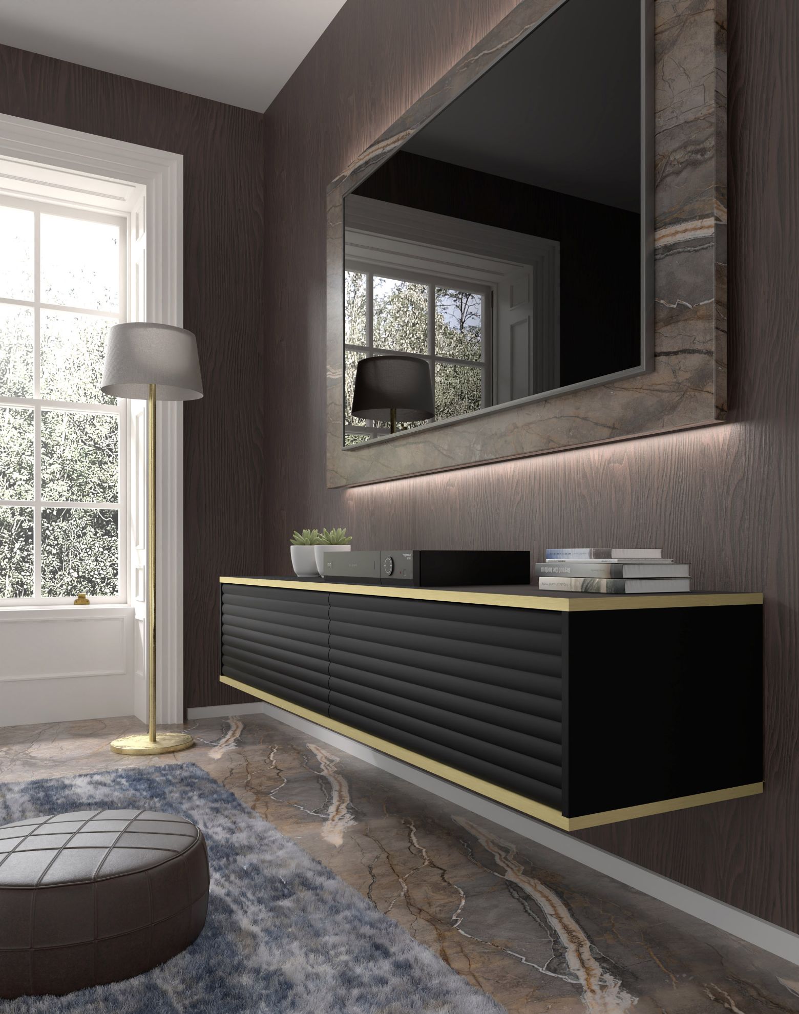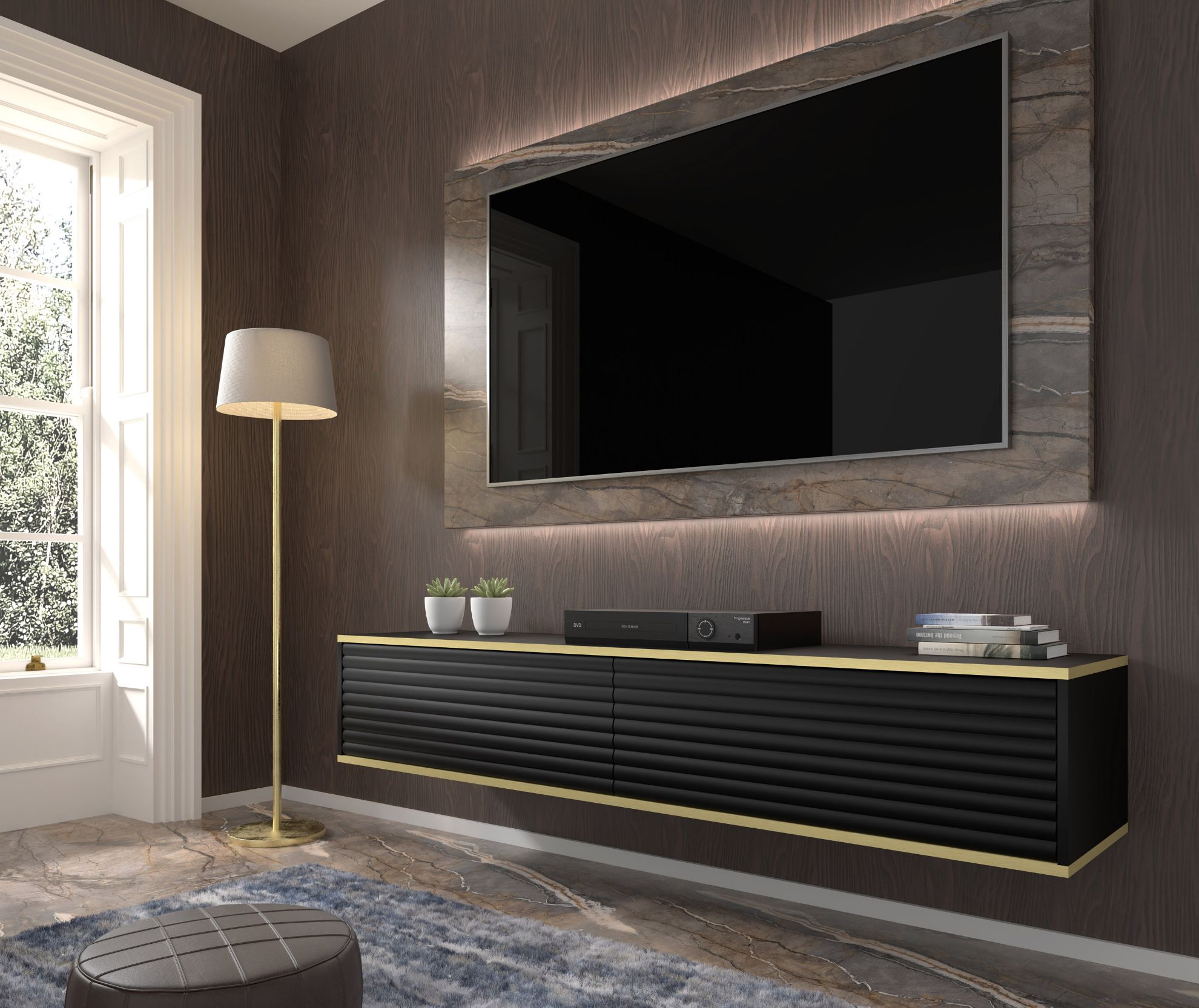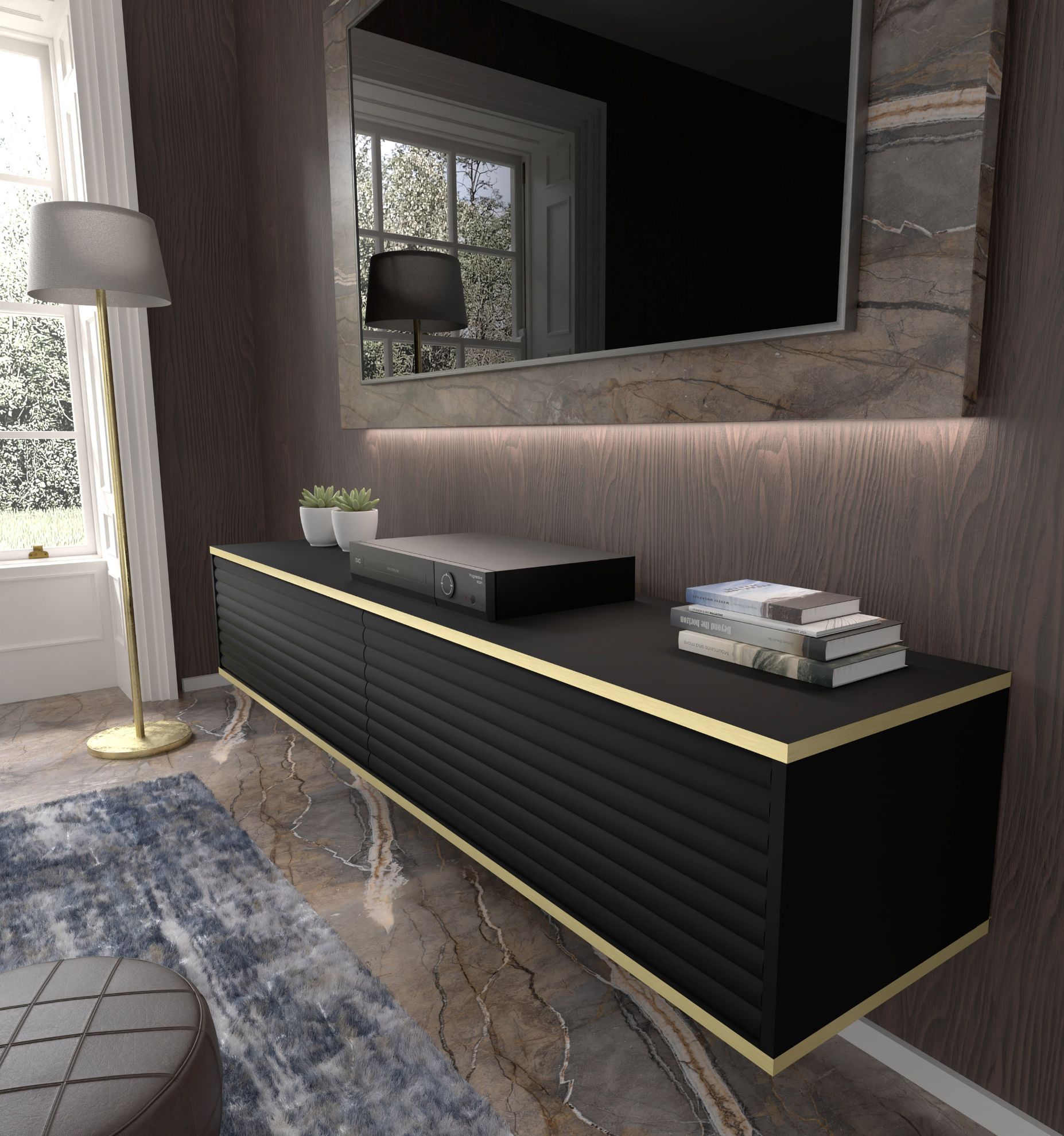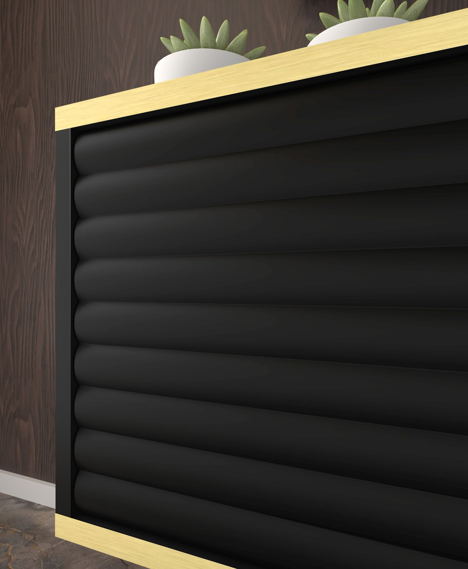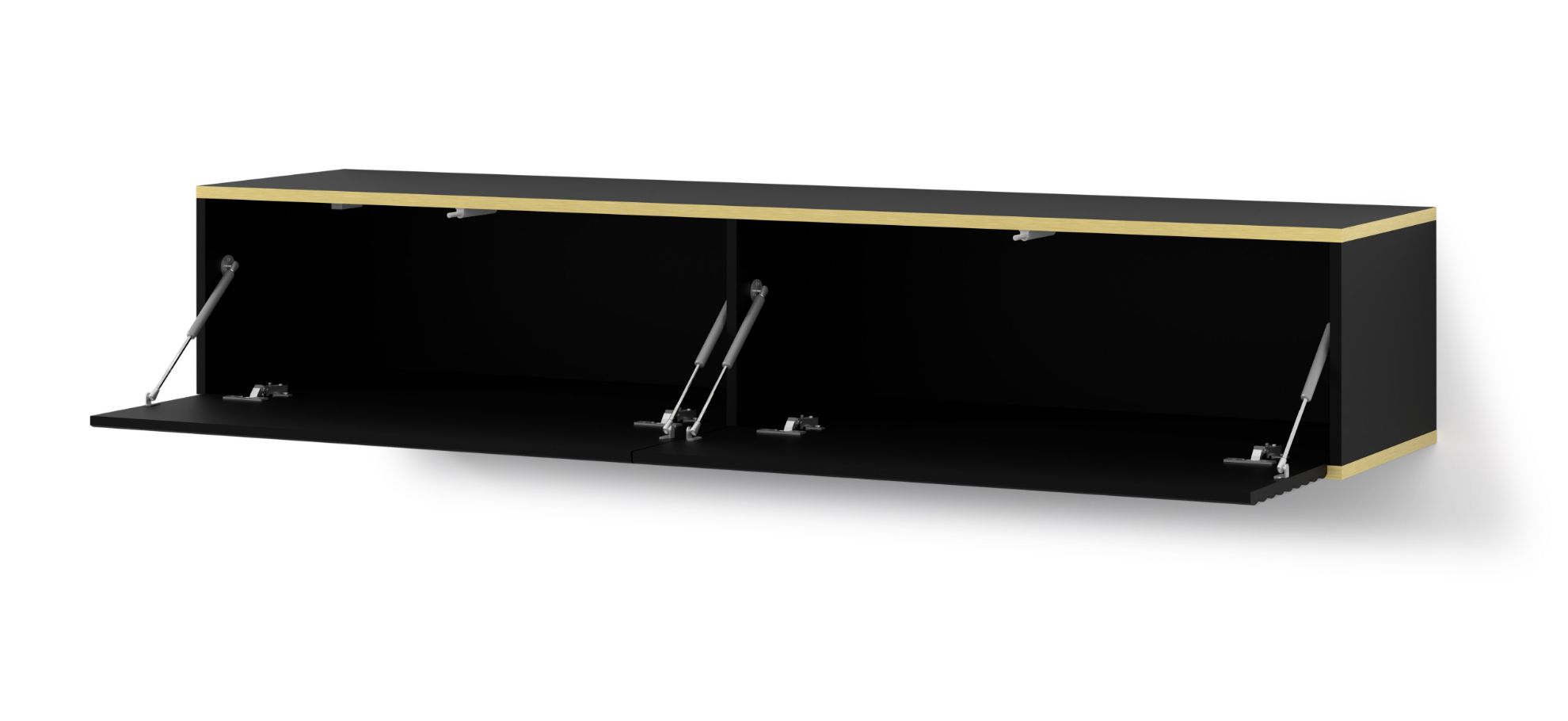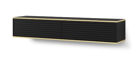 Szafka RTV wisząca Bunia 180 w eleganckim czarnym macie z złotą ozdobną wstawką to nie tylko mebel, ale wyrazisty element designerski, który wkomponuje się doskonale w salon, sypialnię czy pokój młodzieżowy. Jego staranne wykonanie i nowoczesny design sprawiają, że Bunia nie tylko spełnia funkcję praktyczną, ale również nadaje wnętrzu unikalny charakter.