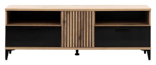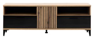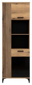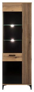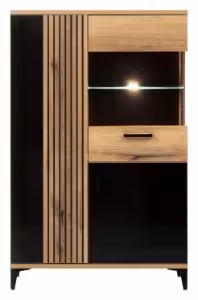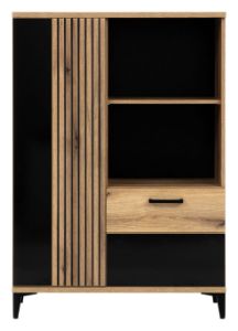 Kolekcja Aris to doskonałe połączenie klasyki z nowoczesnością, które sprawdzi się zarówno w pokoju dziennym, jak i sypialni. Ciepły odcień dębu evoke zestawiony z eleganckimi, czarnymi frontami w połysku nadaje meblom wyrafinowanego charakteru, podkreślając ich wyjątkowy styl. Fronty wzbogacone efektem lameli dodają głębi i unikalnej struktury, czyniąc aranżację wnętrza jeszcze bardziej efektowną.