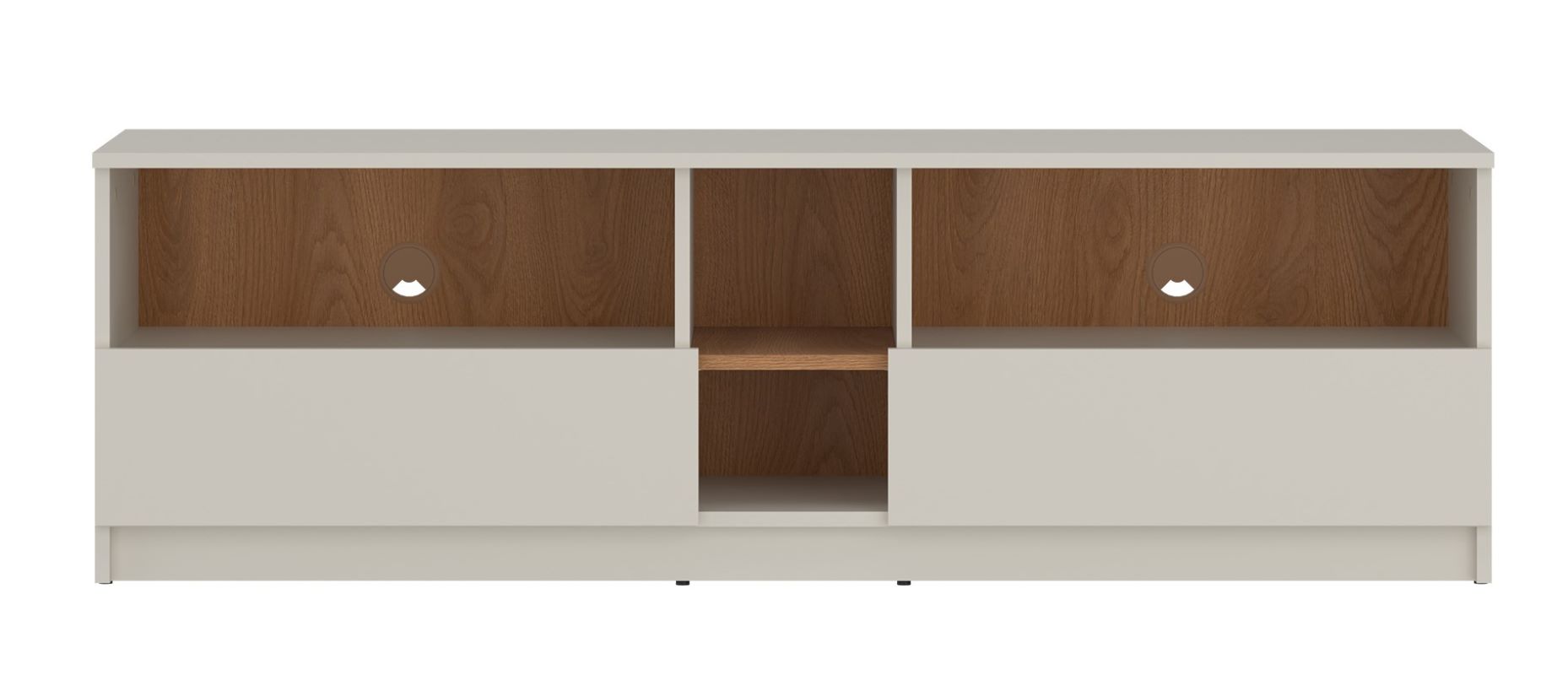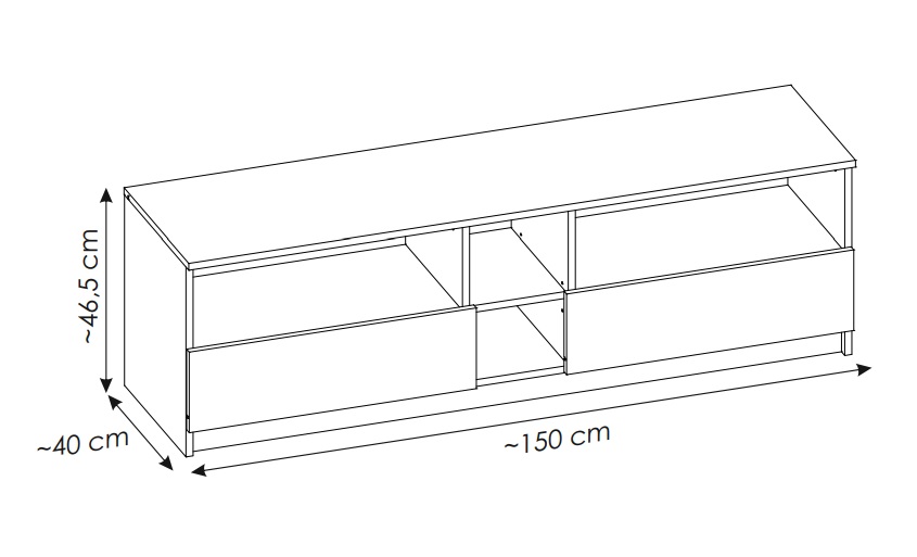 Szafka RTV Fano 2S została wyposażona w dwie pojemne szuflady z prowadnicami kulkowymi, umożliwiającymi pełny wysuw i łatwy dostęp do przechowywanych akcesoriów. Otwarta przestrzeń półek pozwala na wygodne ustawienie sprzętu multimedialnego, konsoli czy dekodera. Dodatkowym atutem są otwory w tylnej części szafki, które pomagają w estetycznej organizacji przewodów.