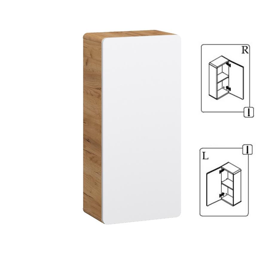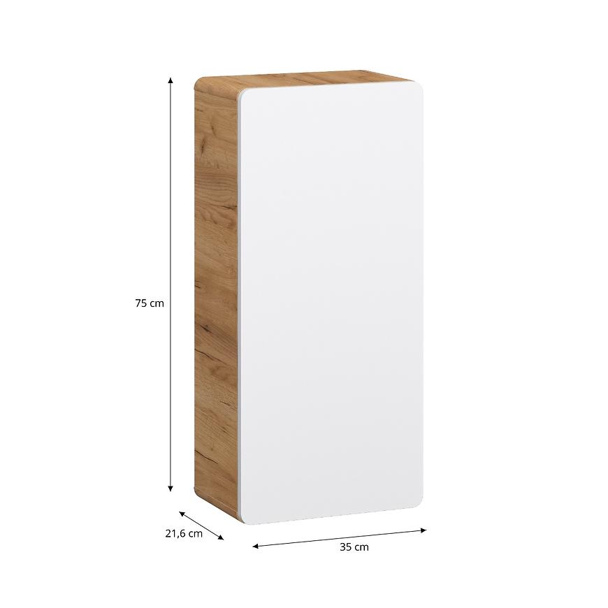 Szafka wisząca Bronx 35 dąb craft – biały połysk to funkcjonalny i stylowy mebel łazienkowy o wymiarach 75×35×21,6 cm. Front wykonany z płyty MDF pokrytej folią PVC w białym połysku harmonijnie łączy się z korpusem z płyty wiórowej w dekorze dąb craft, tworząc elegancki kontrast. Wyposażona jest w jedne drzwi z frezowanym uchwytem i systemem samodomykania, co zapewnia wygodę użytkowania. Wewnątrz znajdują się dwie praktyczne półki, które ułatwiają przechowywanie i organizację akcesoriów łazienkowych. Szafka podwieszana, przeznaczona do samodzielnego montażu. Zastosowanie wyłącznie w łazience.