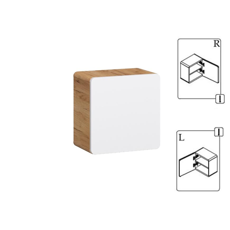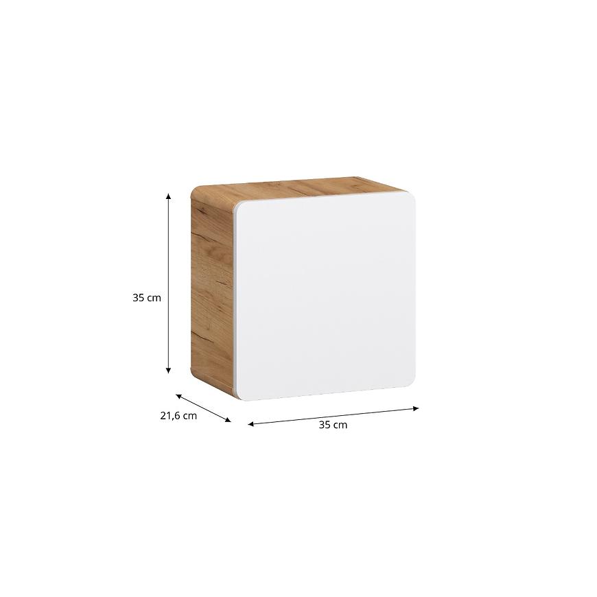 Szafka wisząca Bronx 35 kubik dąb craft – biały połysk to nowoczesny i funkcjonalny element wyposażenia łazienki, łączący kompaktowe wymiary 35×35×21,6 cm z eleganckim designem. Front z płyty MDF w białym połysku, pokryty folią PVC, harmonizuje z korpusem z płyty wiórowej w dekorze dąb craft. Mebel wyposażony jest w jedne drzwi z frezowanym uchwytem i systemem samodomykania, co gwarantuje wygodę użytkowania. Wnętrze skrywa dwie praktyczne półki, umożliwiające przechowywanie akcesoriów łazienkowych. Szafka podwieszana, przeznaczona do samodzielnego montażu. Przeznaczona wyłącznie do łazienki.