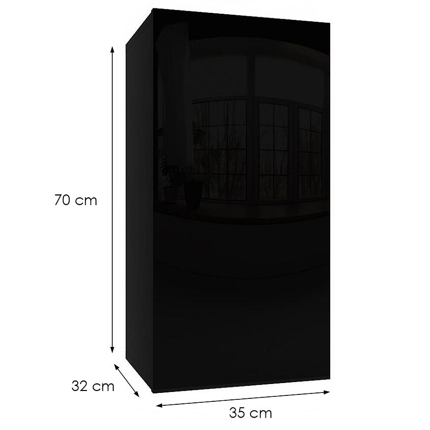 Szafka wisząca Izumi-21-BL w kolorze czarny mat/połysk to nowoczesna półka z frontami z kolekcji IZUMI. Jej wymiary to 35 cm szerokości, 70 cm wysokości i 32 cm głębokości. Wykonana z laminowanej płyty wiórowej, łączy wykończenie matowe i połyskowe, co nadaje meblowi elegancki i nowoczesny wygląd. Szafka waży 11,9 kg i doskonale sprawdzi się w funkcjonalnym, nowoczesnym wnętrzu.