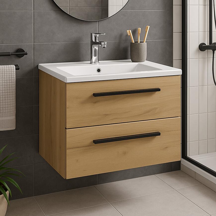 Szafka wisząca Tobi 60 dąb craft to nowoczesna i funkcjonalna szafka łazienkowa o wymiarach 60x46x50 cm. Wykonana z MFC, z frontem i korpusem w dekorze dąb craft, łączy trwałość z eleganckim, naturalnym wyglądem drewna. Model 2-szufladowy, wiszący, przeznaczony do samodzielnego montażu, zapewnia praktyczne miejsce do przechowywania akcesoriów w nowoczesnej łazience. Do szafki polecamy umywalkę Plaza o szerokości 60 cm. Szafka Tobi dostępna jest również w kolorze biały połysk.