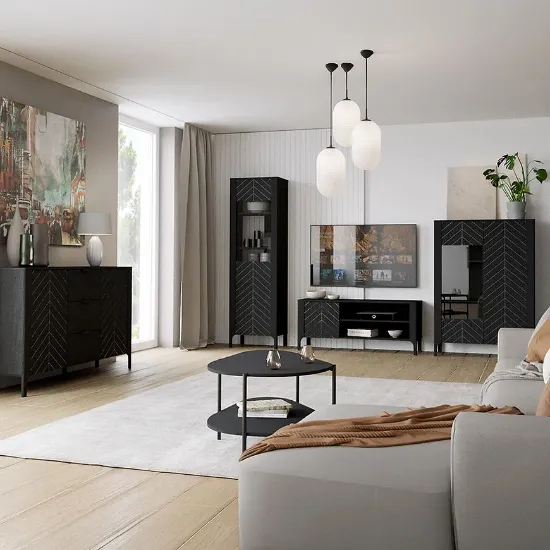Kolekcja mebli do pokoju dziennego Malumi to propozycja dla miłośników nowoczesnego stylu i minimalistycznej elegancji. Wykonane z wysokiej jakości płyty wiórowej laminowanej meble charakteryzują się trwałością i odpornością na codzienne użytkowanie. Dekor black malumi w matowym wykończeniu nadaje kolekcji wyrafinowanego, a jednocześnie uniwersalnego charakteru, dzięki czemu doskonale komponuje się z różnymi aranżacjami wnętrz.