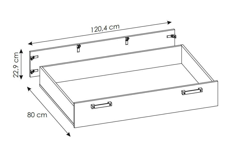 Szuflada ma szerokość 119,5 cm, wysokość 22,9 cm i głębokość 80 cm, dzięki czemu zapewnia dużą pojemność przy zachowaniu kompaktowych wymiarów, łatwo dopasowując się pod łóżko w pokoju młodzieżowym. Minimalistyczny design sprawia, że mebel harmonijnie współgra z resztą kolekcji Nubi.