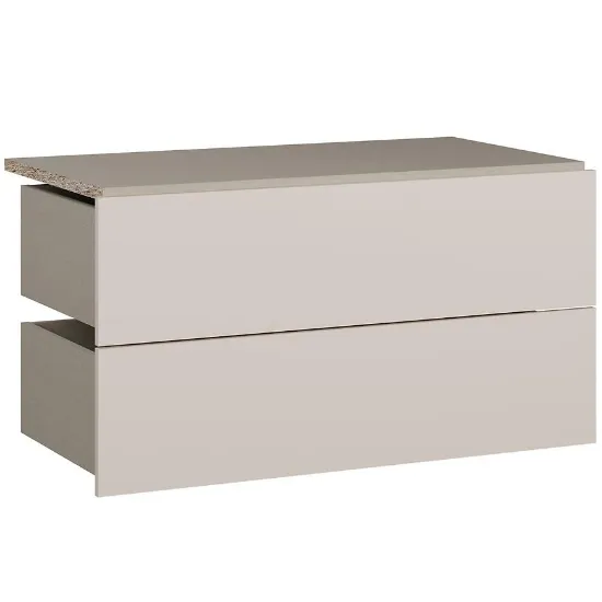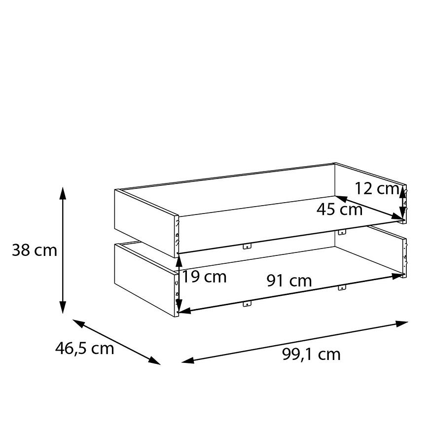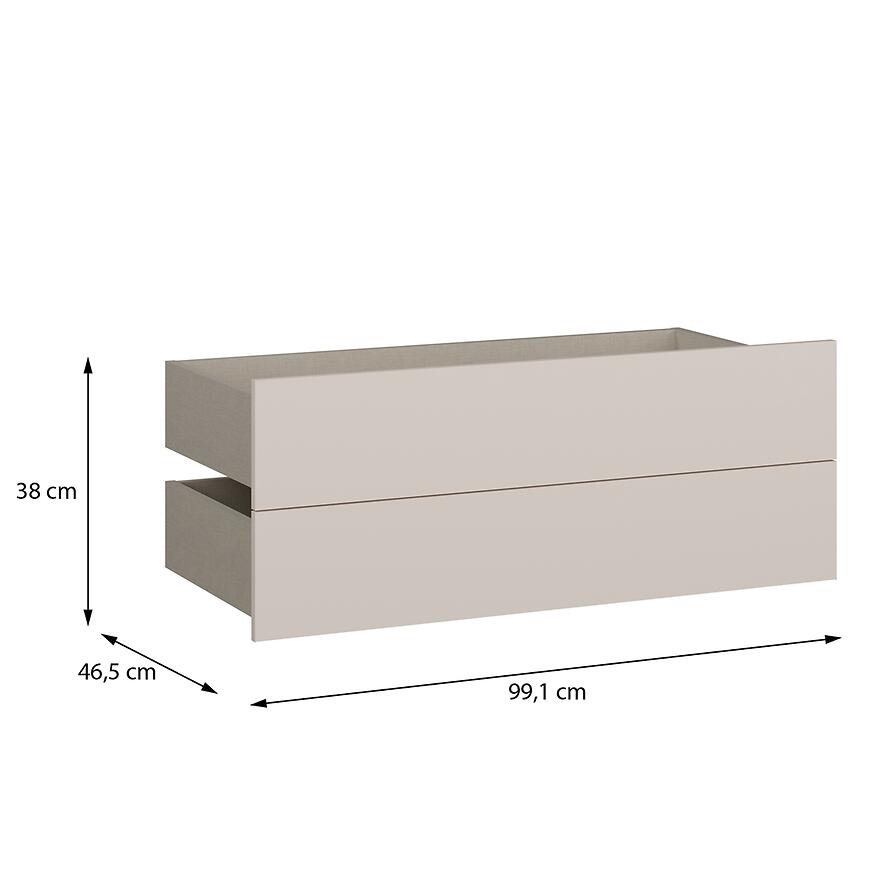 Każda szuflada ma 99,1 cm szerokości, 38 cm wysokości i 46,5 cm głębokości, zapewniając wygodne miejsce do przechowywania ubrań i akcesoriów. Wykonane z płyty wiórowej laminowanej, łączą trwałość z lekką konstrukcją, a waga 11,5 kg gwarantuje stabilność i wygodę użytkowania.