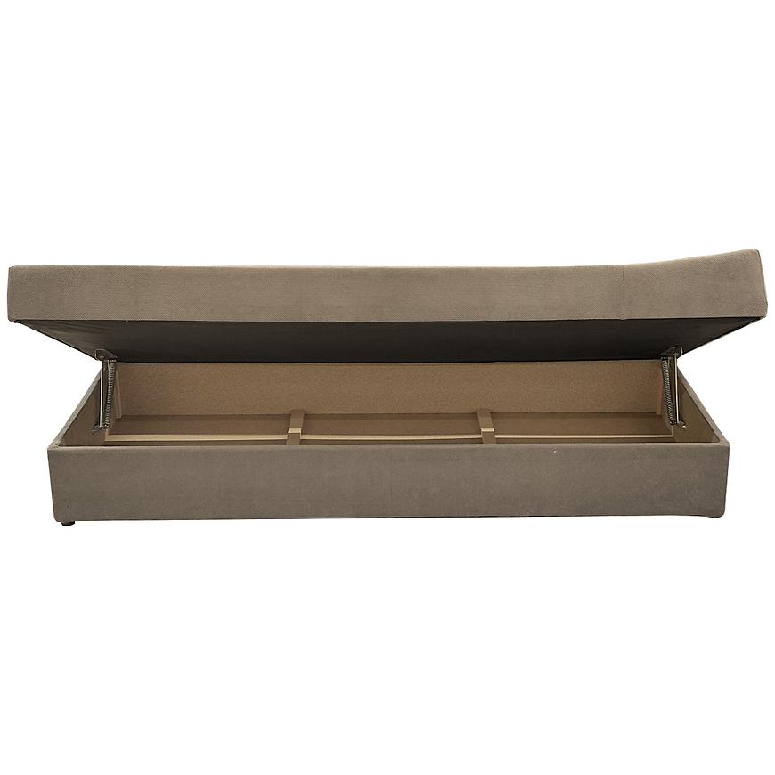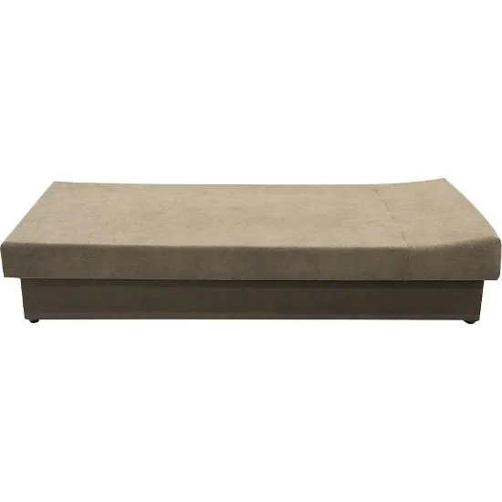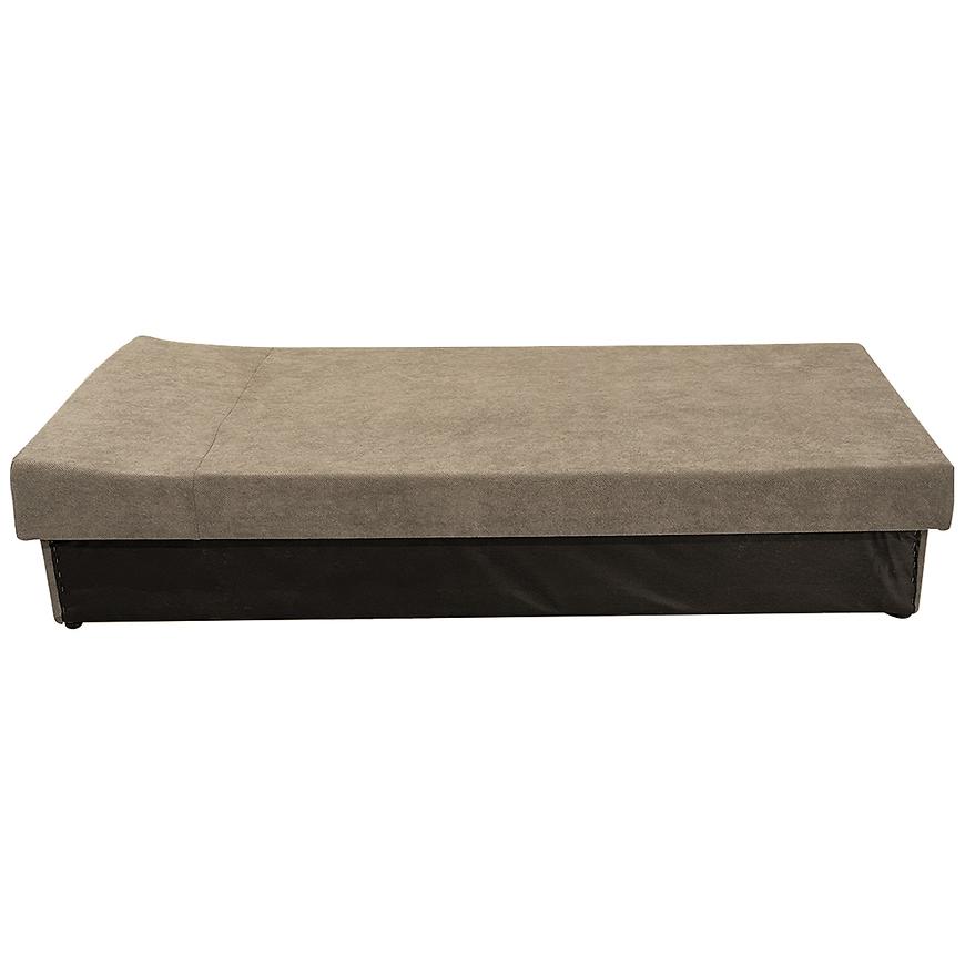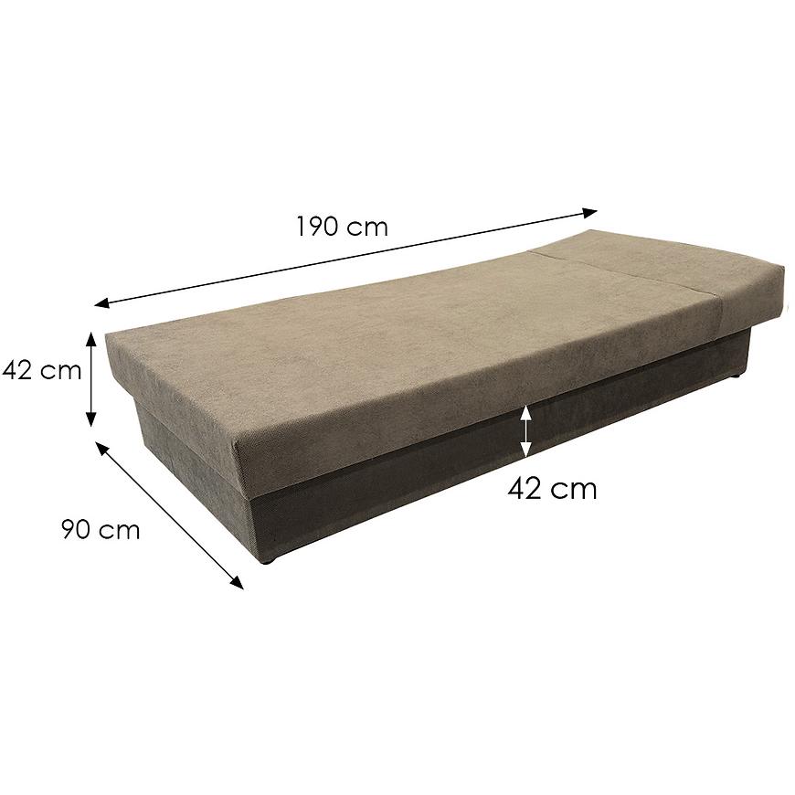Tapczan został wykończony trwałą, przyjemną w dotyku tkaniną, która świetnie się prezentuje i jest łatwa w utrzymaniu czystości. Wewnątrz zastosowano sprężynę bonell, co gwarantuje odpowiednie podparcie ciała i komfort snu. Praktyczny schowek na pościel pozwala zaoszczędzić miejsce i zachować porządek w pokoju. Całość dopełniają solidne, czarne nogi, które podkreślają klasyczny charakter mebla i zapewniają stabilność konstrukcji.