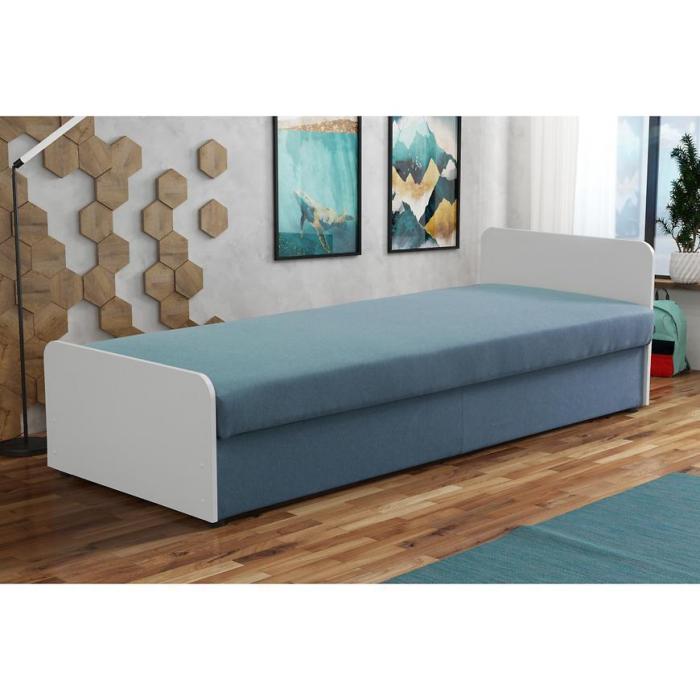 Tapczan został obity tkaniną w kolorze niebieskim, wprowadzając do wnętrza przyjemny, stonowany akcent kolorystyczny. Prosta forma i minimalistyczny design sprawiają, że mebel doskonale komponuje się z nowoczesnymi aranżacjami wnętrz. Brak nóg podkreśla jego kompaktowy charakter, a w komplecie znajdują się poduszki dopełniające komfort użytkowania.
