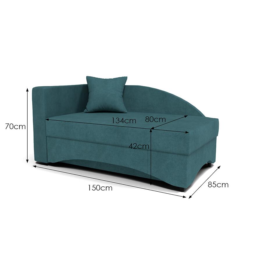 Tapczan ma 150 cm szerokości, 85 cm głębokości oraz 70 cm wysokości, zachowując kompaktowe proporcje przy jednoczesnym zapewnieniu funkcji spania. Produkt wymaga złożenia, a jego konstrukcja umożliwia szybki i wygodny montaż.