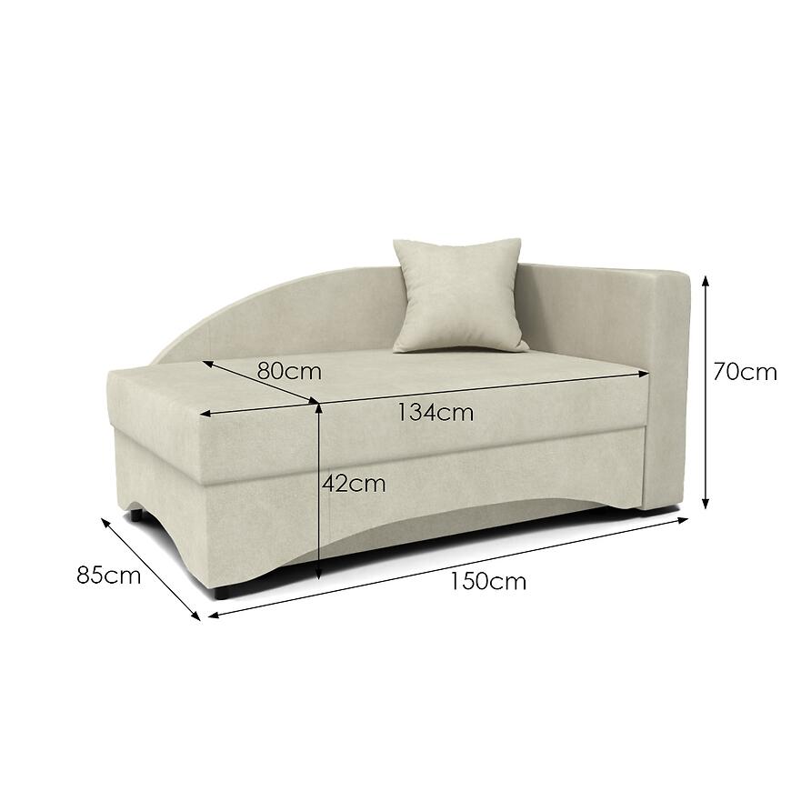 Tapczan ma 150 cm szerokości, 85 cm głębokości oraz 70 cm wysokości, zachowując kompaktowe proporcje przy jednoczesnej funkcji spania. Produkt wymaga złożenia, a jego konstrukcja została przygotowana tak, aby montaż przebiegał sprawnie i bezproblemowo.