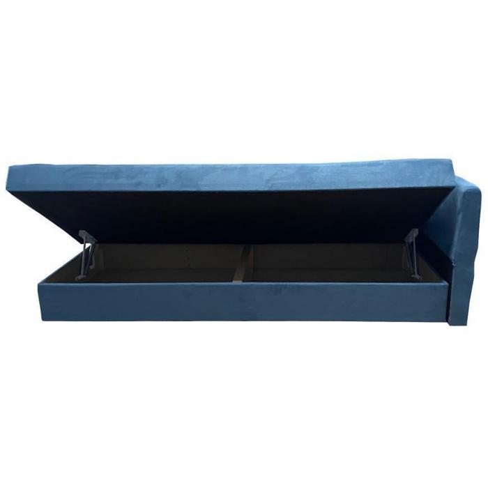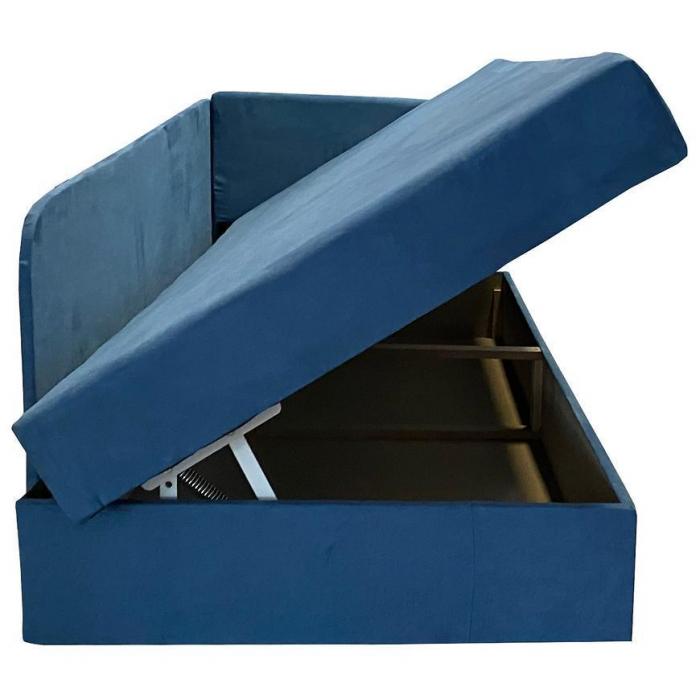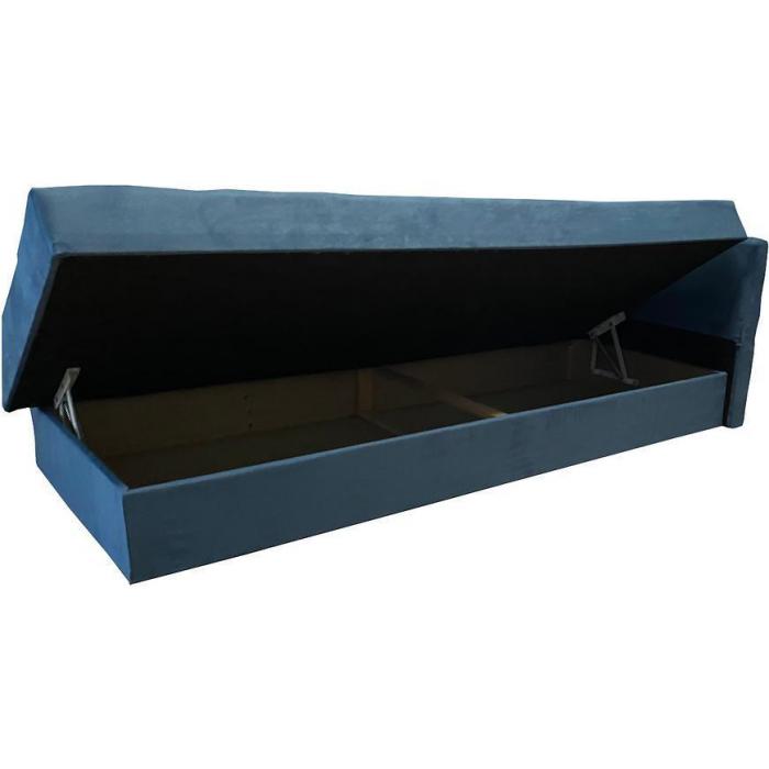 Tapczan obity został tkaniną w kolorze niebieskim, dzięki czemu wprowadza do wnętrza świeży i przyjemny akcent kolorystyczny. Prosta forma i minimalistyczny design sprawiają, że mebel pasuje zarówno do nowoczesnych, jak i klasycznych aranżacji wnętrz. Tapczan stoi na nogach, co ułatwia sprzątanie pod meblem, a orientacja prawa pozwala na dopasowanie go do układu pomieszczenia.