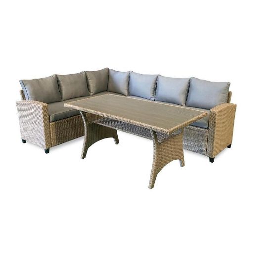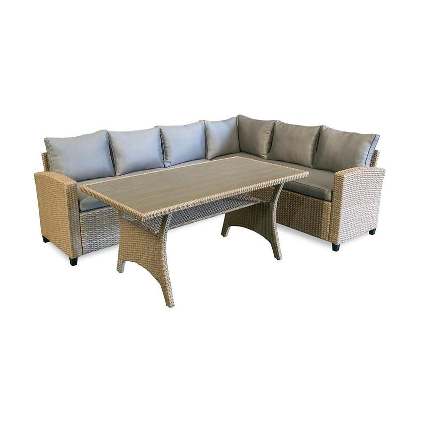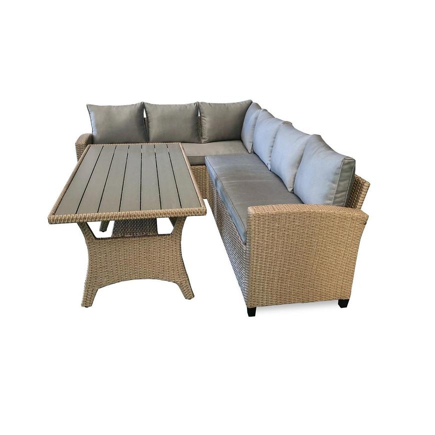 Narożnik jest wyposażony w grube i wygodne poduszki, które zapewniają wyjątkowy komfort siedzenia. Dzięki nim, spędzanie czasu na tarasie lub w ogrodzie staje się jeszcze przyjemniejsze. Wysoki stół obiadowy jest praktycznym dodatkiem, który umożliwia wygodne spożywanie posiłków na świeżym powietrzu. Blat stołu został wykonany z nowoczesnego pollywood, który jest trwały i łatwy w czyszczeniu.