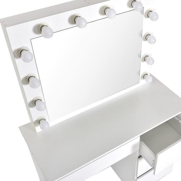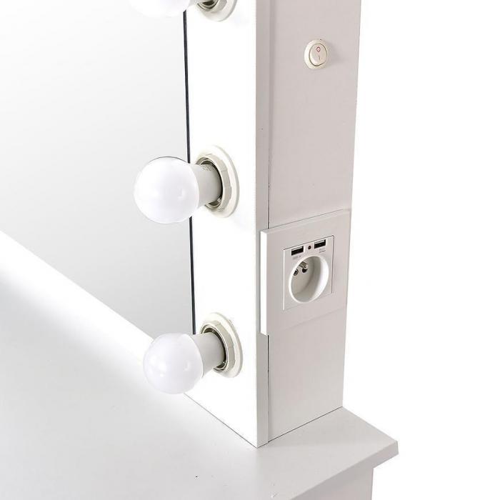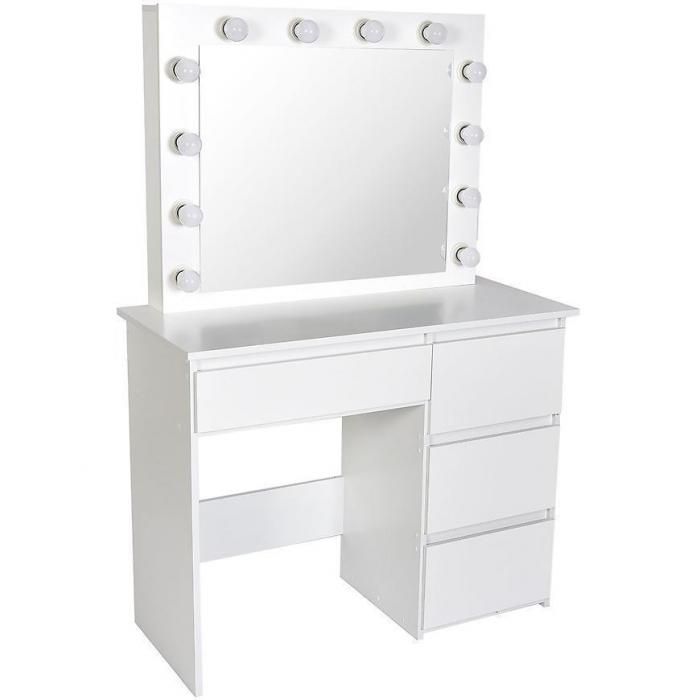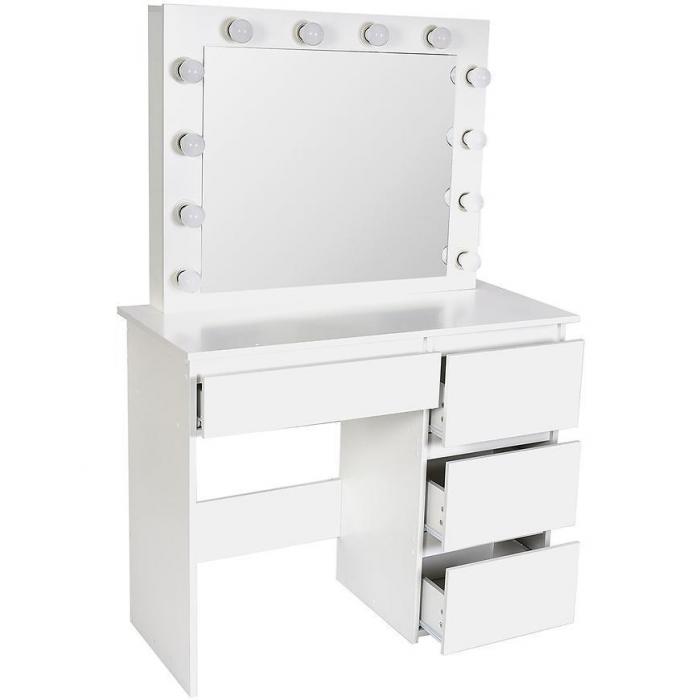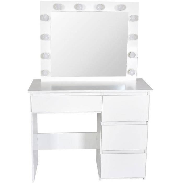 Toaletka z lustrem to świetna propozycja do sypialni lub pokoju młodzieżowego. Toaletka posiada lustro oraz cztery szuflady. Dodatkowym udogodnieniem jest wmontowane gniazdko USB. Wykonana została z płyty wiórowej laminowanej. Całość jest nowoczesna oraz wprowadza elegancję do wnętrza. Wpasuje się w większość aranżacji.