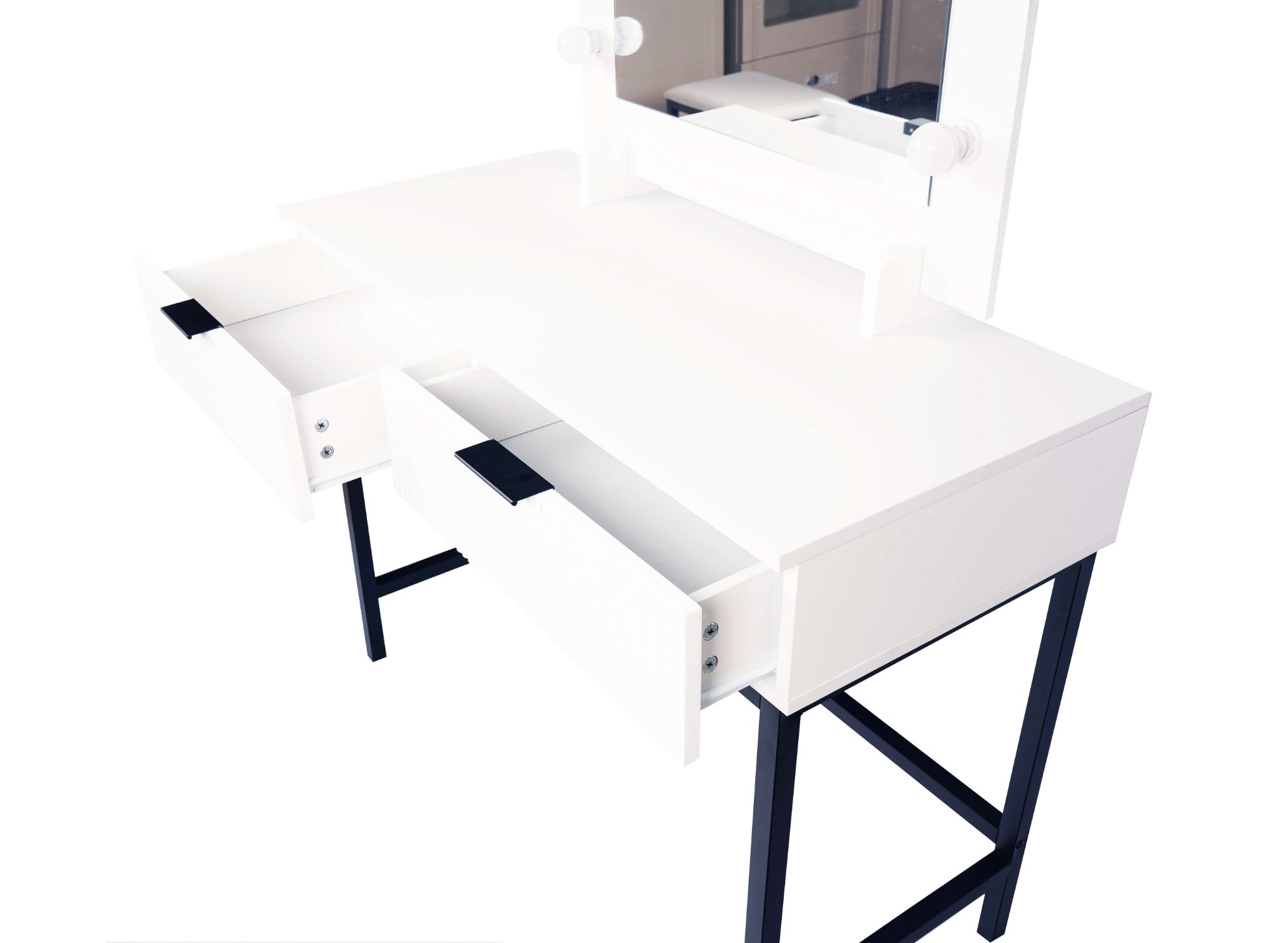 Nogi toaletki w kolorze czarnym stanowią ciekawy kontrast do białego blatu, nadając całości nowoczesnego charakteru. Solidne i stabilne, zapewniają bezpieczeństwo i komfort użytkowania. Czarne nogi dodają toaletce elegancji i wyrafinowania, tworząc stylowy akcent, który przyciąga wzrok.