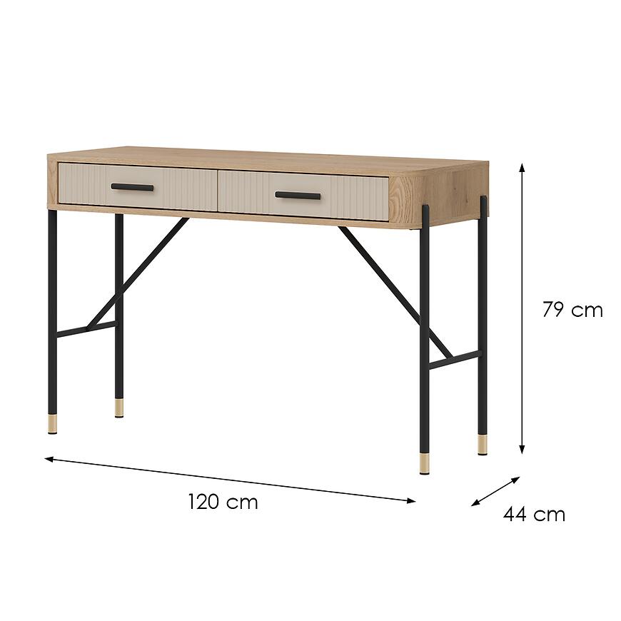 Toaletka ma wymiary 120 cm szerokości, 44 cm głębokości i 79 cm wysokości, co zapewnia komfortową przestrzeń do codziennej pielęgnacji, makijażu oraz przechowywania akcesoriów. Dwuszufladowa konstrukcja umożliwia utrzymanie porządku i przechowywanie kosmetyków, biżuterii lub innych drobiazgów w zasięgu ręki.