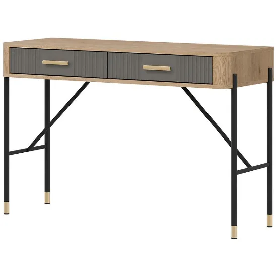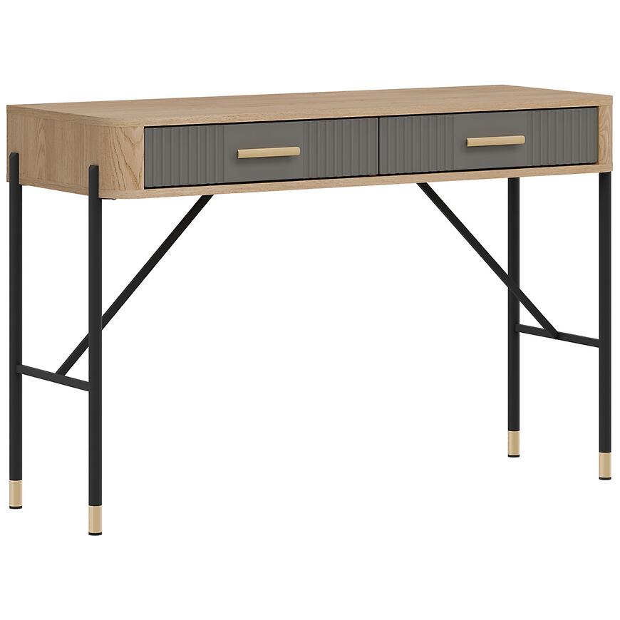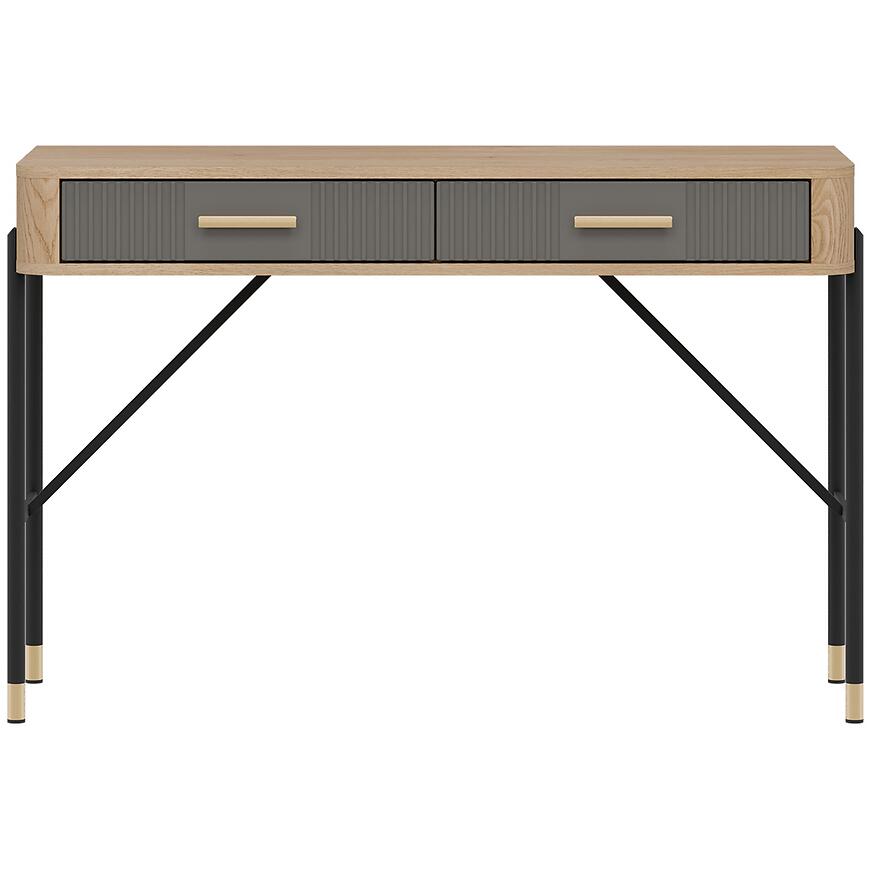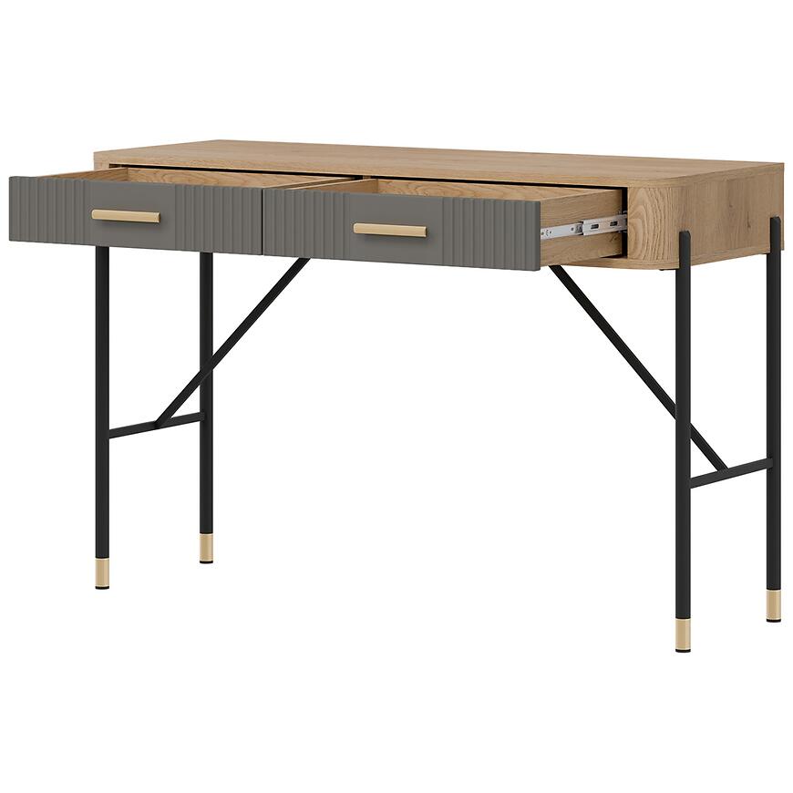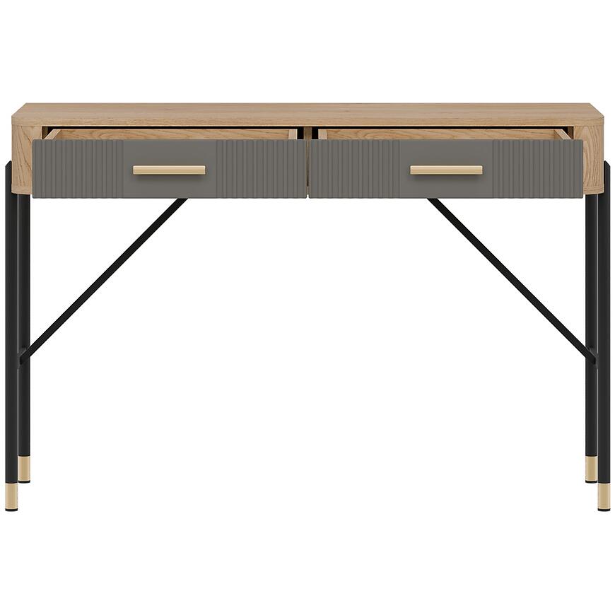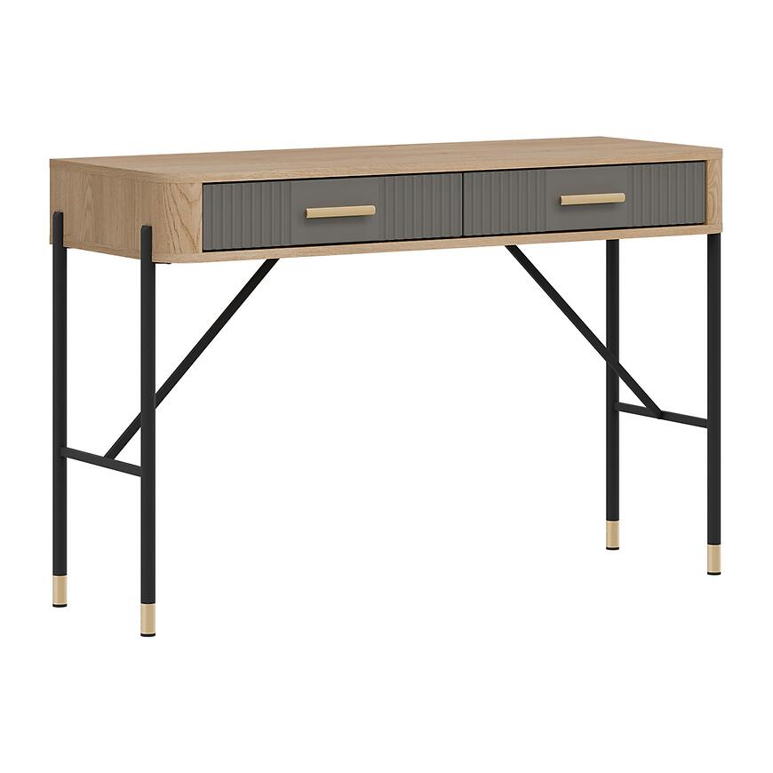 Korpus toaletki wykonano z laminowanej płyty wiórowej w kolorze dąb Cremona, a fronty z płyty MDF w szarym matowym wykończeniu. Takie połączenie materiałów gwarantuje trwałość, odporność na codzienne użytkowanie i łatwość utrzymania czystości. Dwie praktyczne szuflady zwiększają funkcjonalność mebla i pozwalają wygodnie przechowywać kosmetyki, biżuterię czy inne drobiazgi.