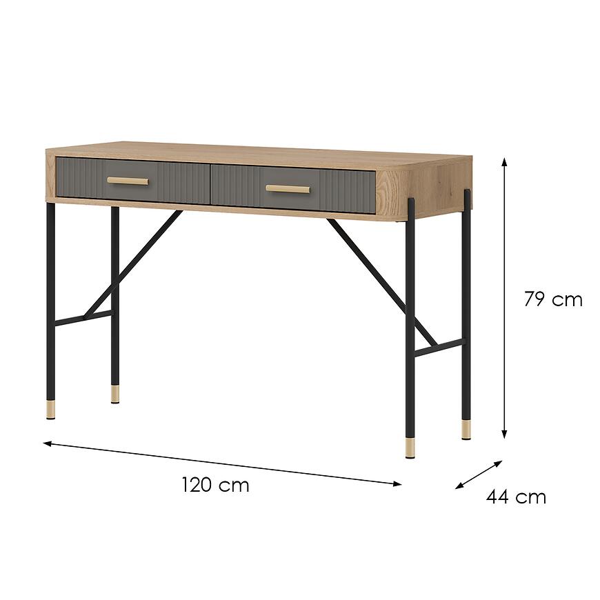 Toaletka ma 120 cm szerokości, 44 cm głębokości i 79 cm wysokości, zapewniając komfortową przestrzeń do codziennej pielęgnacji, makijażu oraz przechowywania kosmetyków. Dwuszufladowa konstrukcja umożliwia utrzymanie porządku i wygodne przechowywanie najważniejszych akcesoriów w zasięgu ręki.