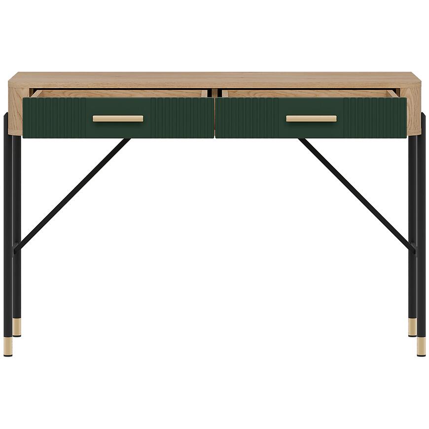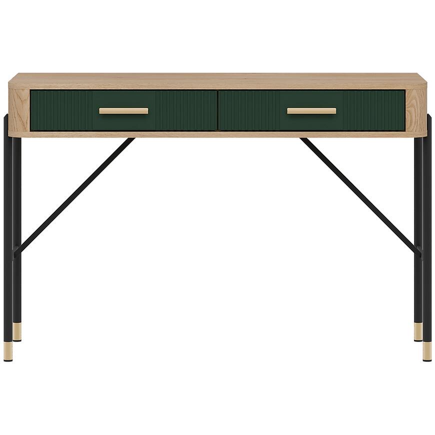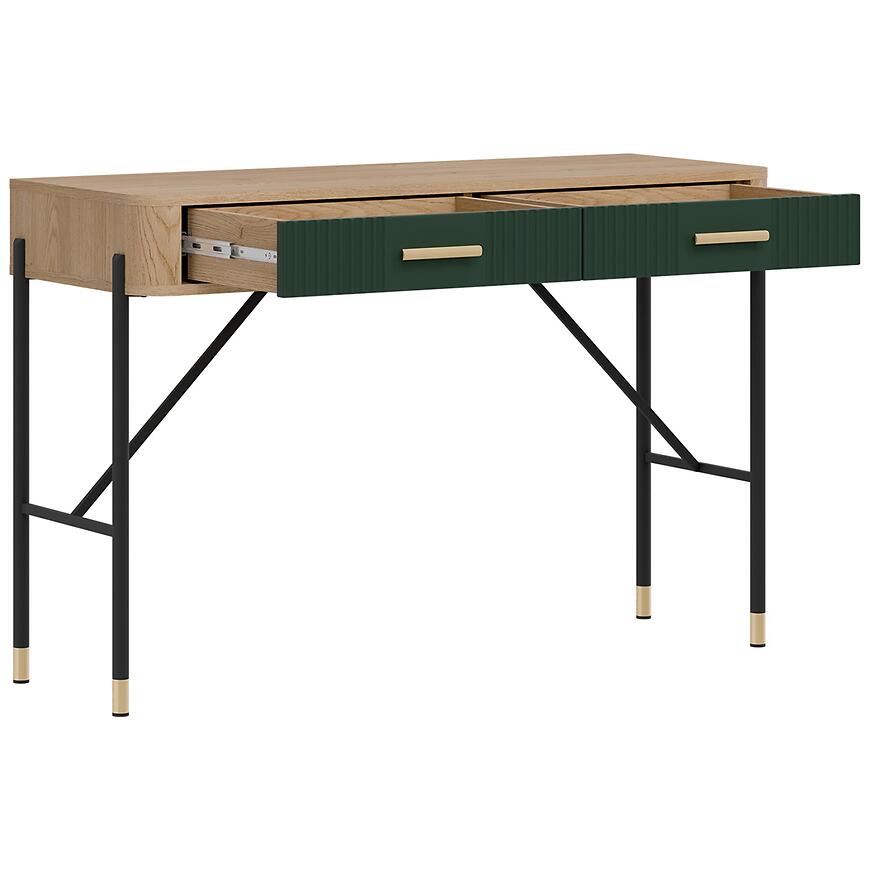 Korpus toaletki wykonano z laminowanej płyty wiórowej w kolorze dąb Cremona, a fronty z płyty MDF w zielonym matowym wykończeniu. Takie połączenie materiałów gwarantuje trwałość, odporność na codzienne użytkowanie i łatwość utrzymania czystości. Dwie praktyczne szuflady zwiększają funkcjonalność mebla, umożliwiając wygodne przechowywanie niezbędnych akcesoriów.