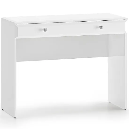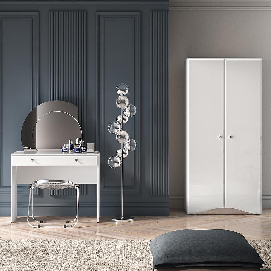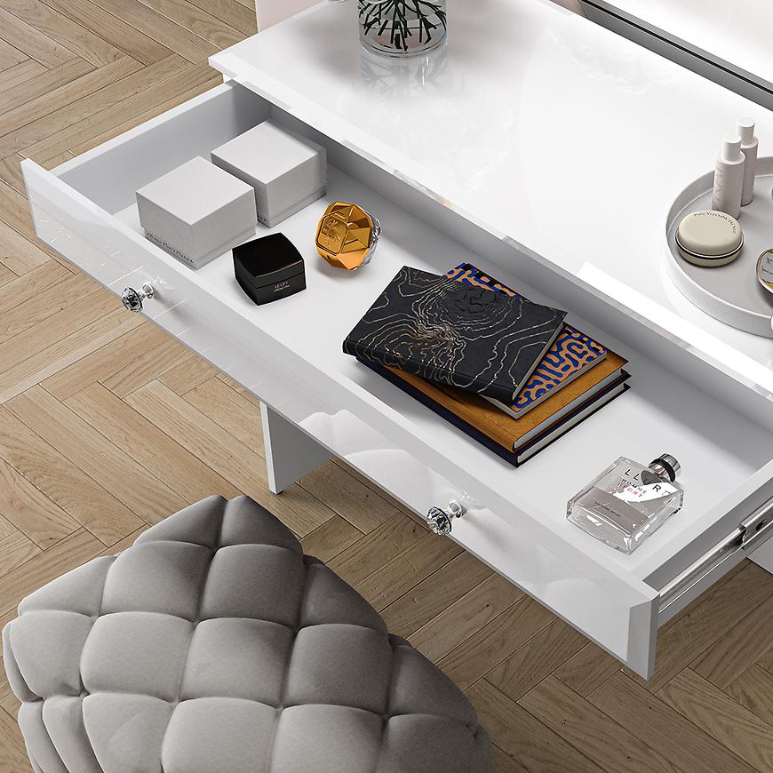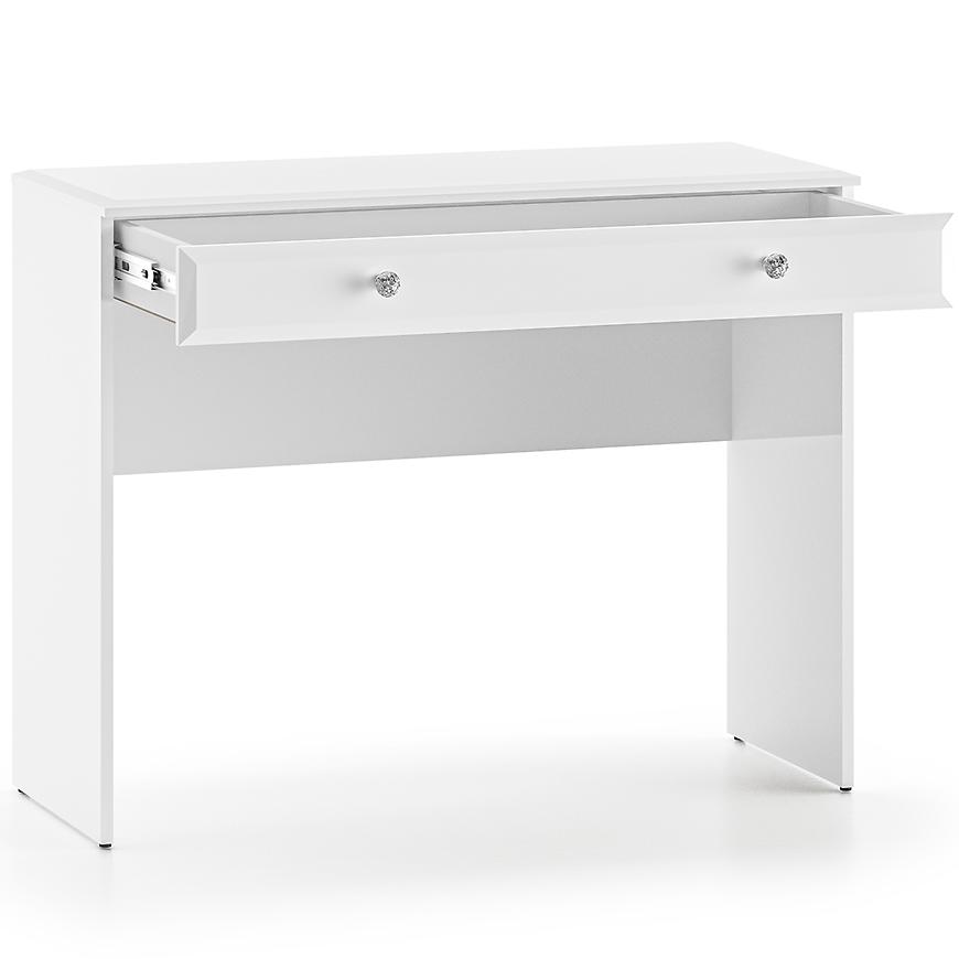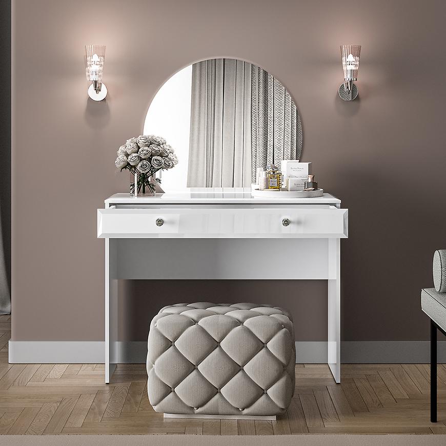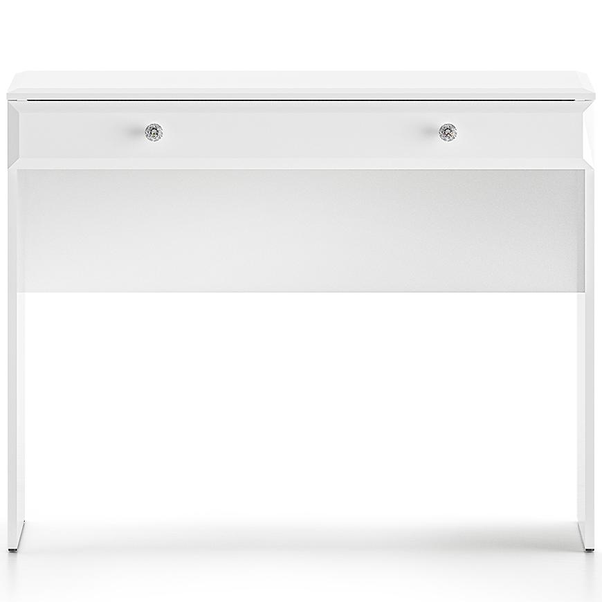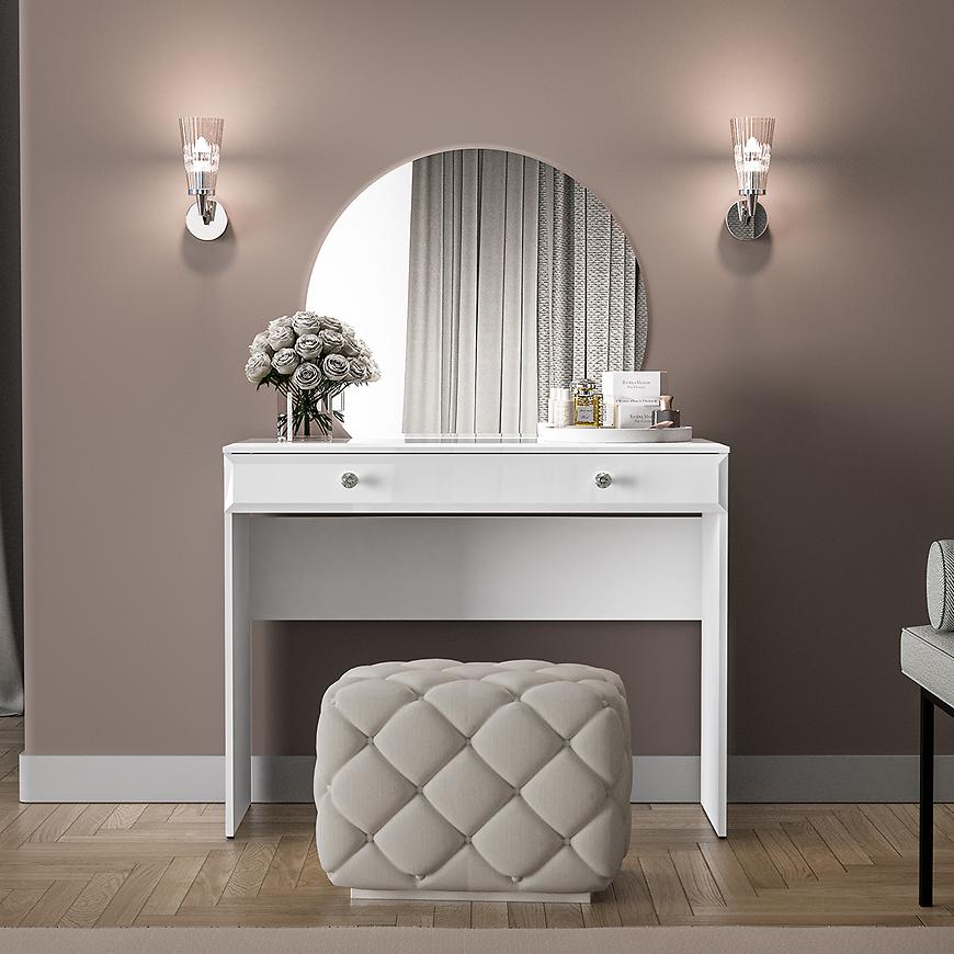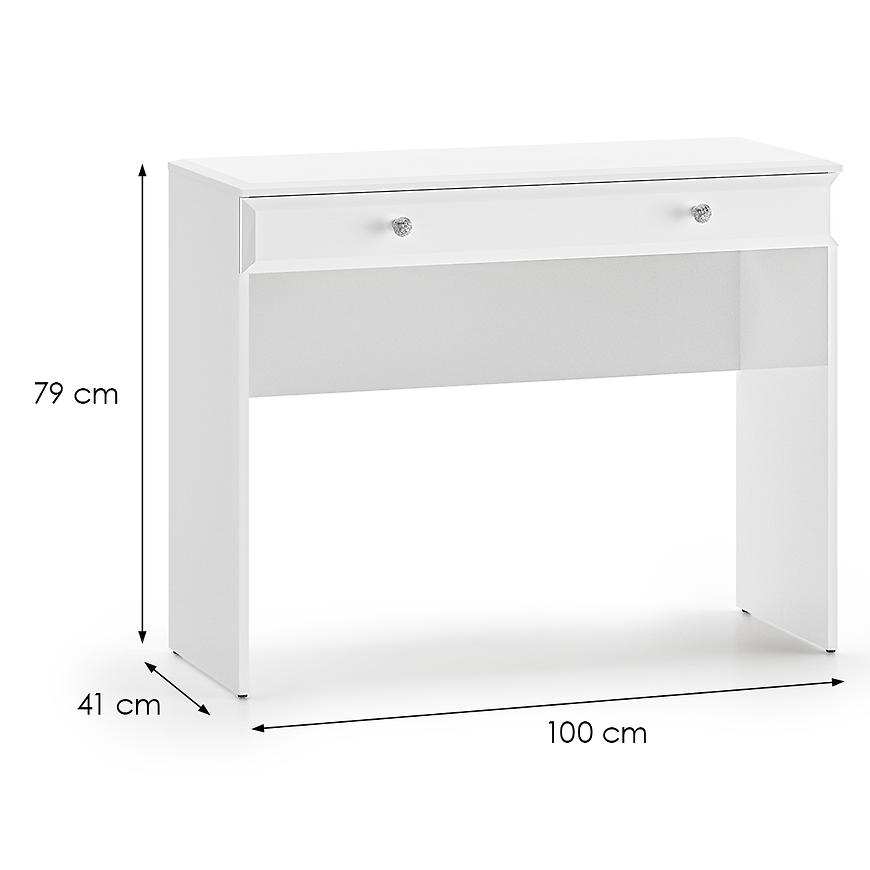 Nowoczesna toaletka Glamour 0501 w kolorze biały połysk to elegancki mebel o minimalistycznym designie. Wykonana z płyty MDF, zachwyca błyszczącym wykończeniem frontów i korpusu. Posiada jedną pojemną szufladę, idealną na kosmetyki i akcesoria. Jej kompaktowe wymiary (100x41x79 cm) sprawdzą się zarówno w większych, jak i mniejszych wnętrzach. Styl glamour i uniwersalna orientacja czynią ją doskonałym wyborem do nowoczesnych aranżacji. Wymaga samodzielnego montażu.