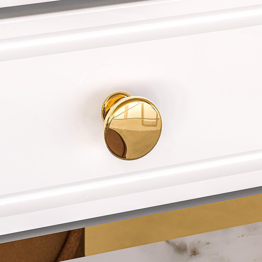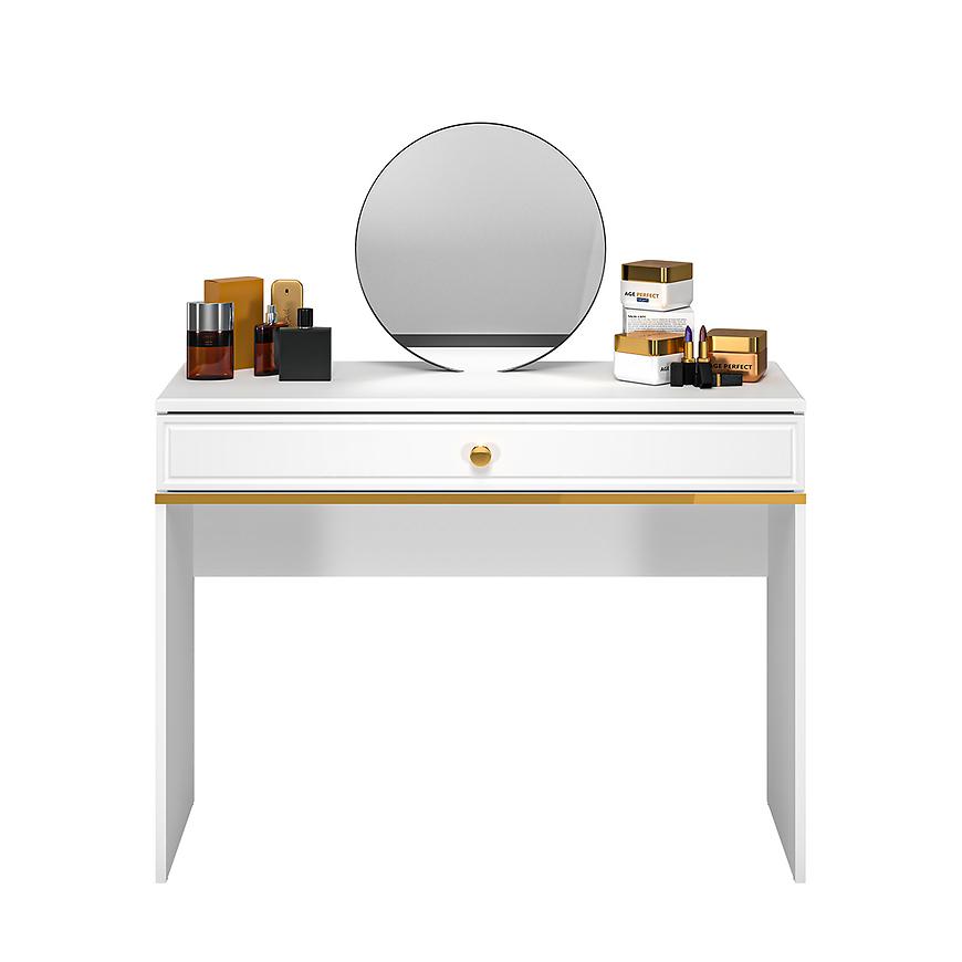 Białe połyskujące wykończenie nadaje toaletce Goldin 10 świeży i nowoczesny charakter, odbijając światło i dodając przestrzeni. Jednodrzwiowy układ z jedną szufladą oferuje praktyczne miejsce do przechowywania, idealne na przechowywanie kosmetyków, biżuterii czy innych niezbędnych akcesoriów.