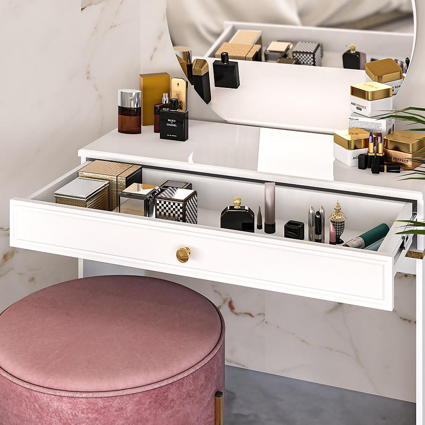 Toaletka Goldin 10 to również element dekoracyjny, który podkreśla nowoczesny styl Twojej przestrzeni. Doskonale sprawdzi się w sypialni, garderobie czy łazience, dodając elegancji i funkcjonalności Twojemu otoczeniu.