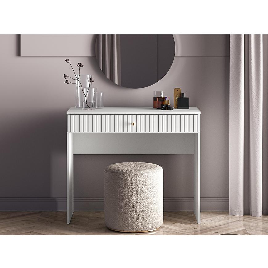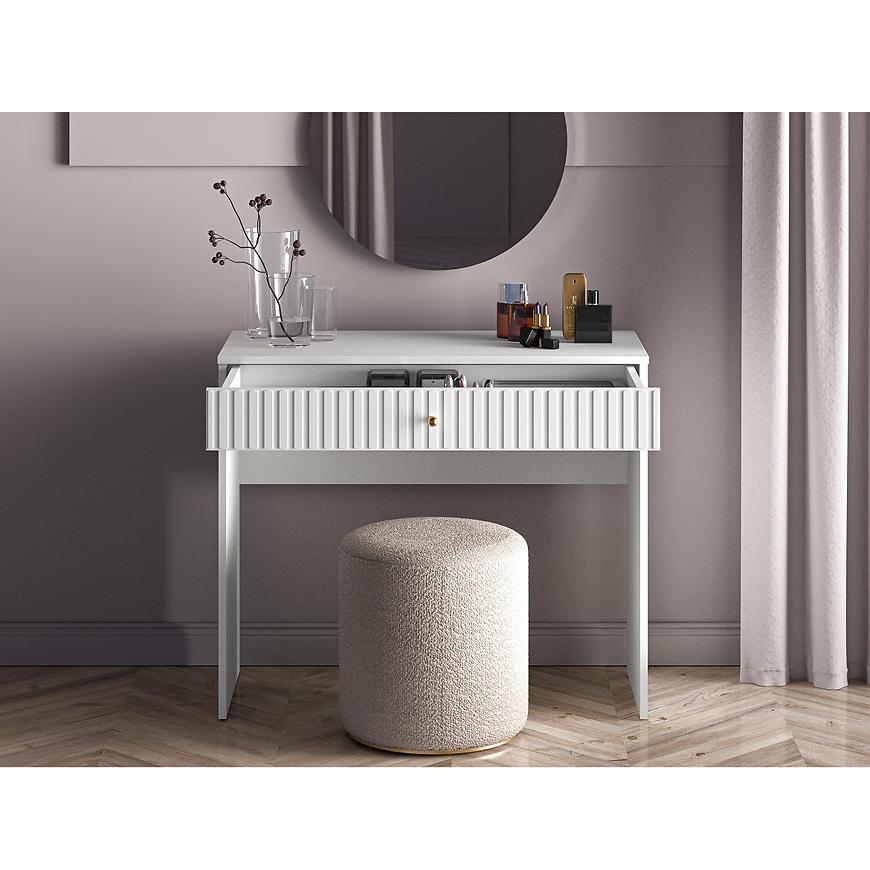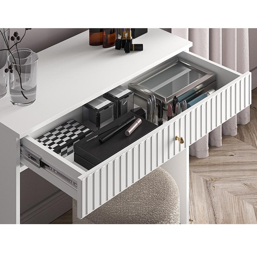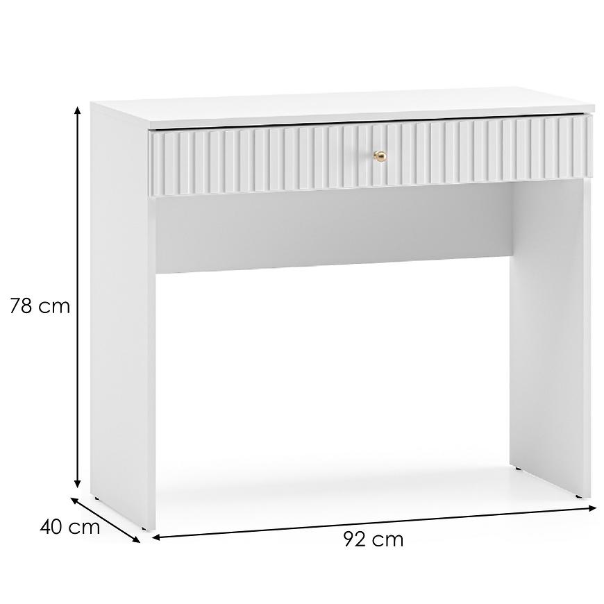 Toaletka Lucy 06 w kolorze białym to elegancki i nowoczesny mebel, idealny do sypialni lub garderoby. Wykonana z połączenia płyty MDF (front) i laminowanej płyty wiórowej (korpus), wyróżnia się trwałością i estetycznym, matowym wykończeniem. Dzięki kompaktowym wymiarom (92 × 78 × 40 cm) zmieści się nawet w mniejszych przestrzeniach. Toaletka posiada jedną praktyczną szufladę do przechowywania kosmetyków i akcesoriów. Uniwersalna orientacja pozwala na łatwe dopasowanie do różnych układów pomieszczenia. Mebel wymaga samodzielnego złożenia.