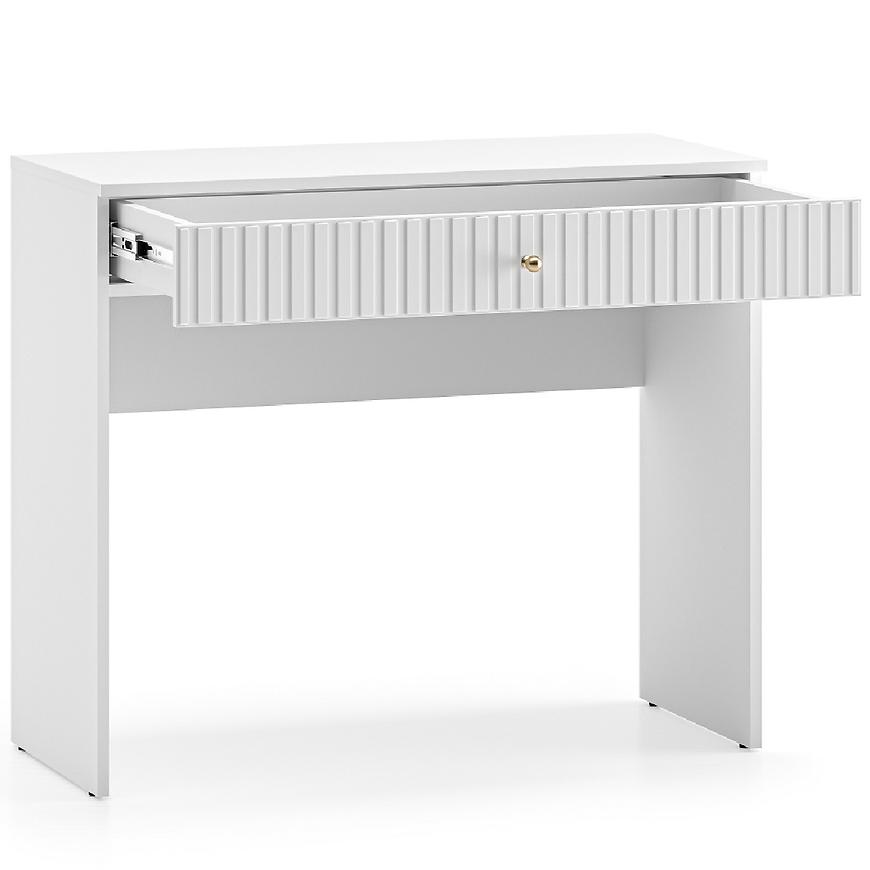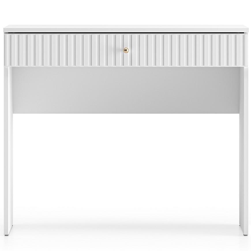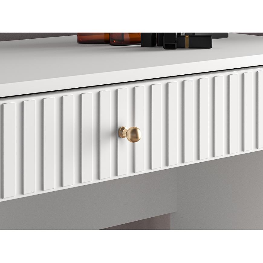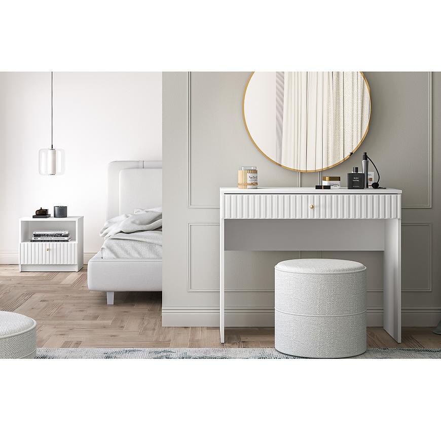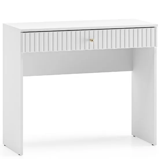 Toaletka Lucy 06 w kolorze białym to elegancki i nowoczesny mebel, idealny do sypialni lub garderoby. Wykonana z połączenia płyty MDF (front) i laminowanej płyty wiórowej (korpus), wyróżnia się trwałością i estetycznym, matowym wykończeniem. Dzięki kompaktowym wymiarom (92 × 78 × 40 cm) zmieści się nawet w mniejszych przestrzeniach. Toaletka posiada jedną praktyczną szufladę do przechowywania kosmetyków i akcesoriów. Uniwersalna orientacja pozwala na łatwe dopasowanie do różnych układów pomieszczenia. Mebel wymaga samodzielnego złożenia.