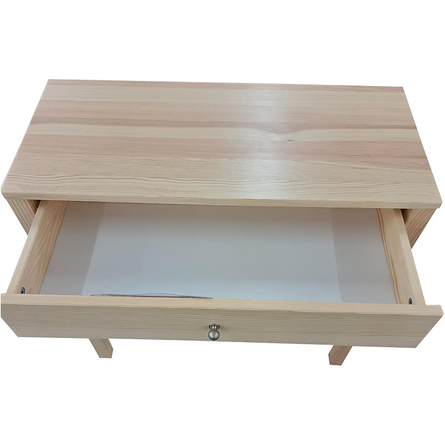 Mebel został wykonany z wysokiej jakości drewna, co zapewnia nie tylko trwałość, ale także estetyczny wygląd. Wybarwienie w jasnym, drewnopodobnym odcieniu sosny nadaje mu subtelności, a wysoka jakość materiałów sprawia, że toaletka zachowa swój urok przez wiele lat. Fronty toaletki mają wykończenie na połysk, co nadaje im elegancji oraz sprawia, że mebel odbija światło, optycznie powiększając przestrzeń.
