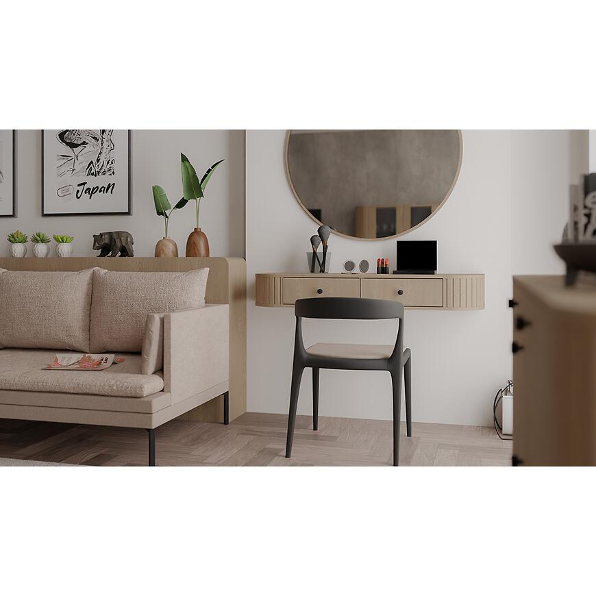 Toaletka łączy funkcjonalność, nowoczesny design i elegancję. Dwie pojemne szuflady zapewniają wygodne miejsce do przechowywania drobnych przedmiotów, a kompaktowe wymiary pozwalają ustawić mebel w różnych miejscach w domu.