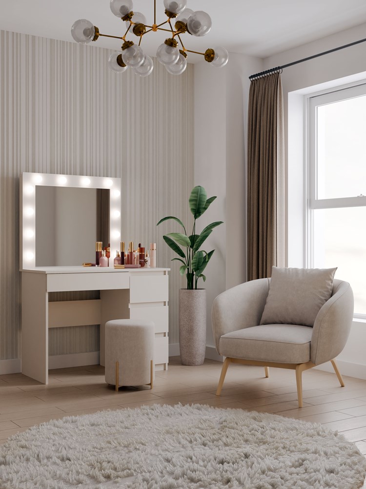Przemyślana konstrukcja toaletki Star umożliwia wygodne przechowywanie kosmetyków i biżuterii, dzięki pojemnym czterem szufladom (3 wysokie szuflady z prawej strony i 1 niska z lewej strony pod blatem). To jednak nie wszystko, ponieważ to niezwykłe mebel spełnia podwójną funkcję, służąc zarówno jako miejsce do przygotowania makijażu i innych zabiegów pielęgnacyjnych, jak i praktyczne biurko, które doskonale wpisuje się w współczesne potrzeby wielozadaniowe.