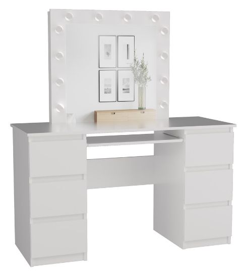 Przemyślana konstrukcja toaletki Star umożliwia wygodne przechowywanie kosmetyków i biżuterii, dzięki pojemnym szufladom (po 3 szuflady z każdej storny biurka). To jednak nie wszystko, ponieważ to niezwykłe mebel spełnia podwójną funkcję, służąc zarówno jako miejsce do przygotowania makijażu i innych zabiegów pielęgnacyjnych, jak i praktyczne biurko, które doskonale wpisuje się w współczesne potrzeby wielozadaniowe.